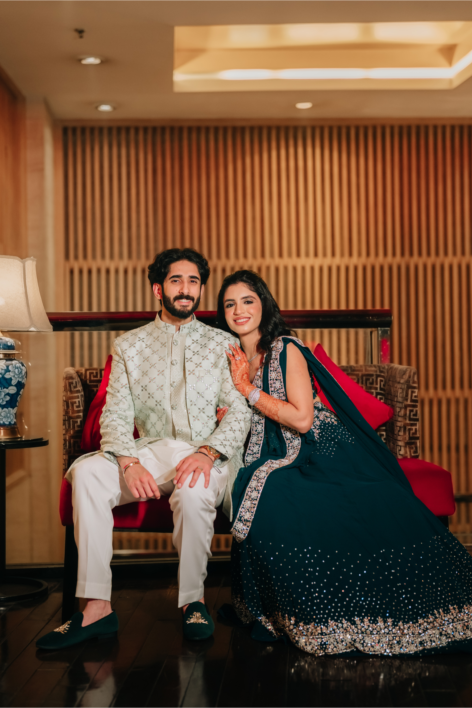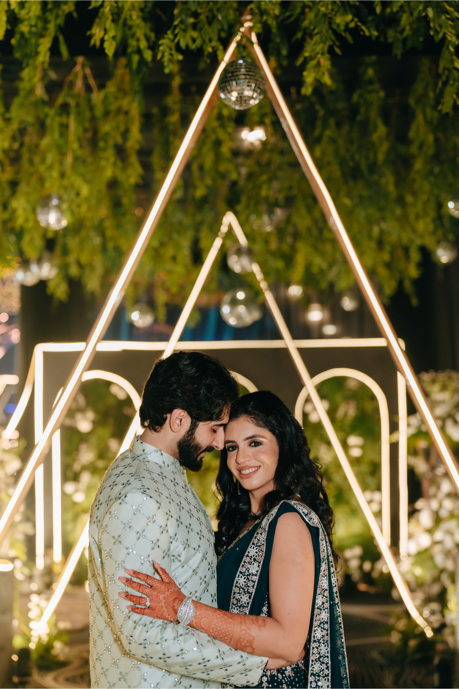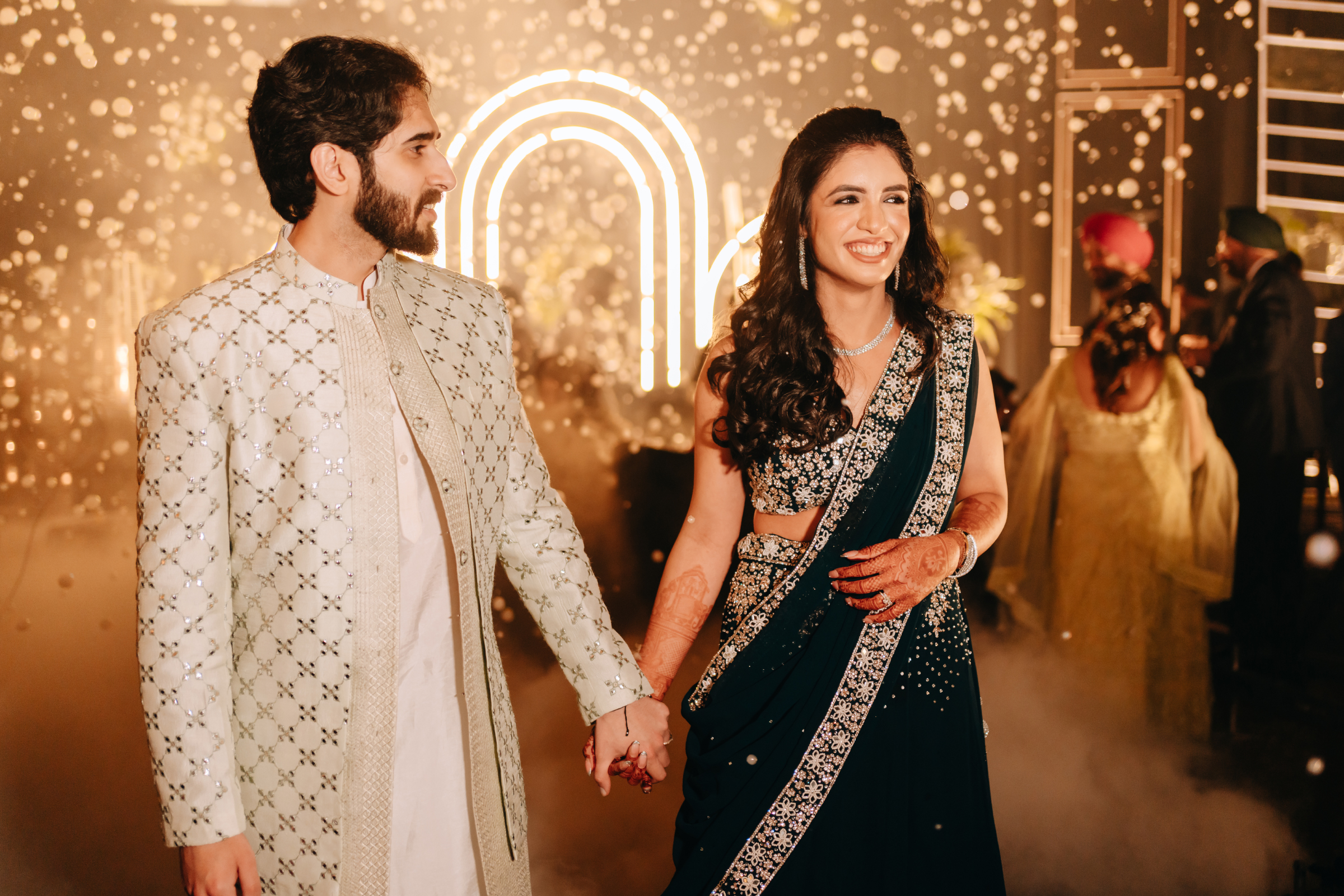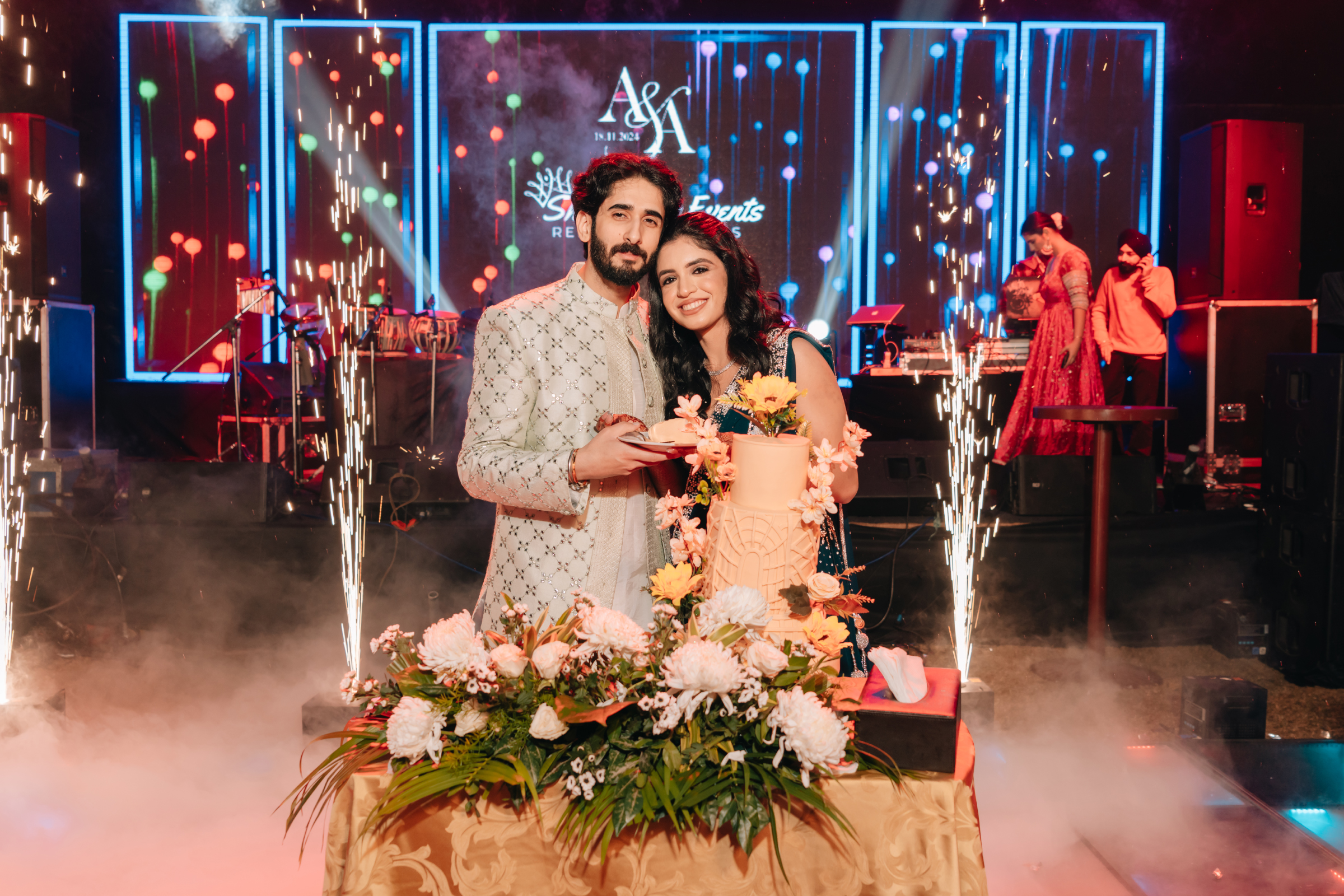 The celebrations ended with a lively reception blending tradition with modern flair—neon lights, live music, smoke effects, and Filmfare-style photo moments. In a playful twist straight out of a Bollywood scene, the couple even insisted the filmmaker join their frame, turning the night into a cinematic memory guests will never forget.