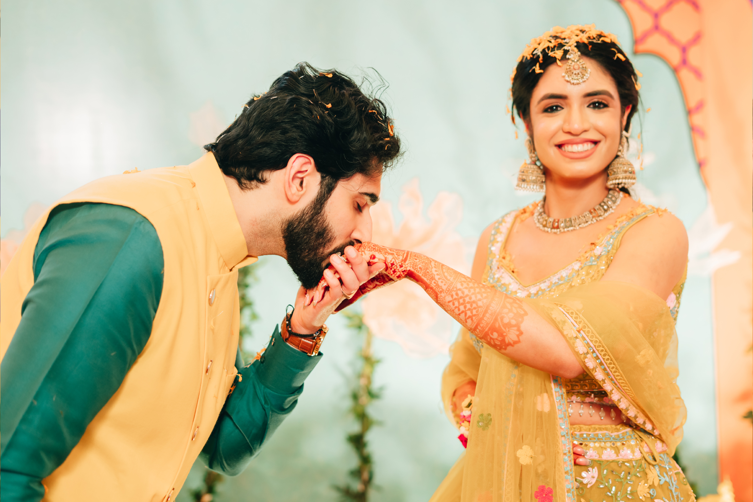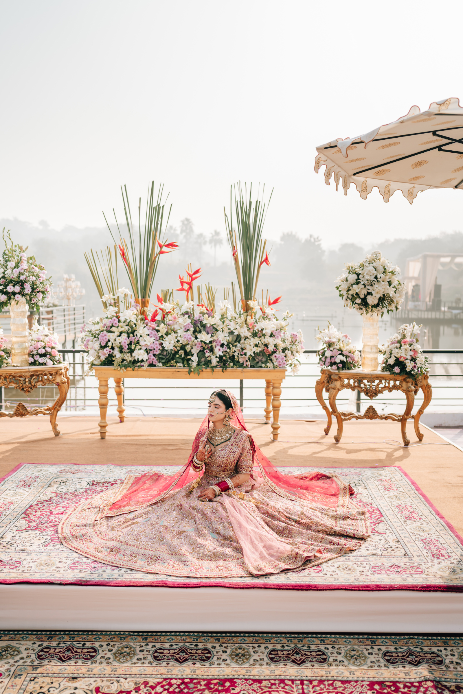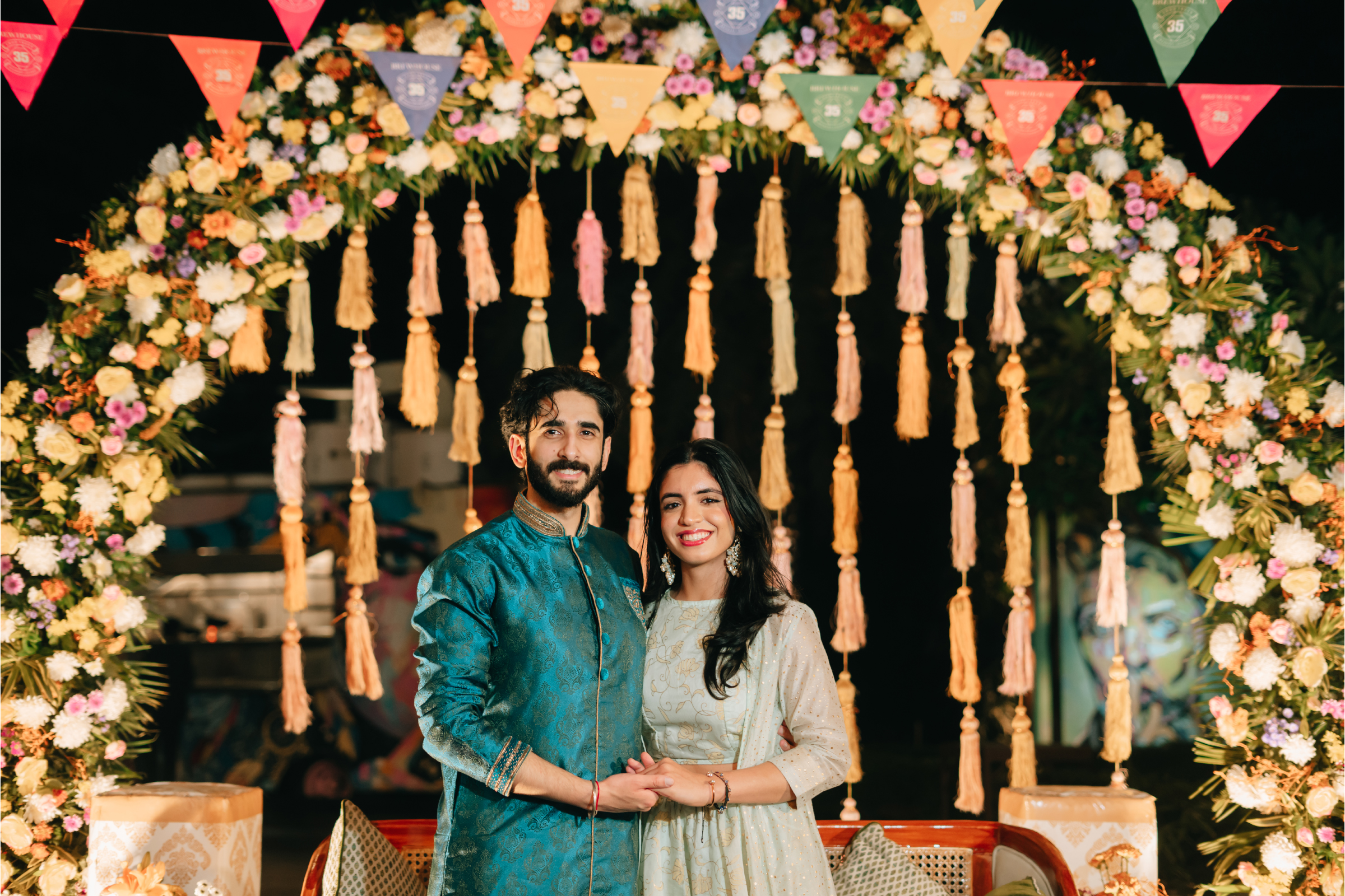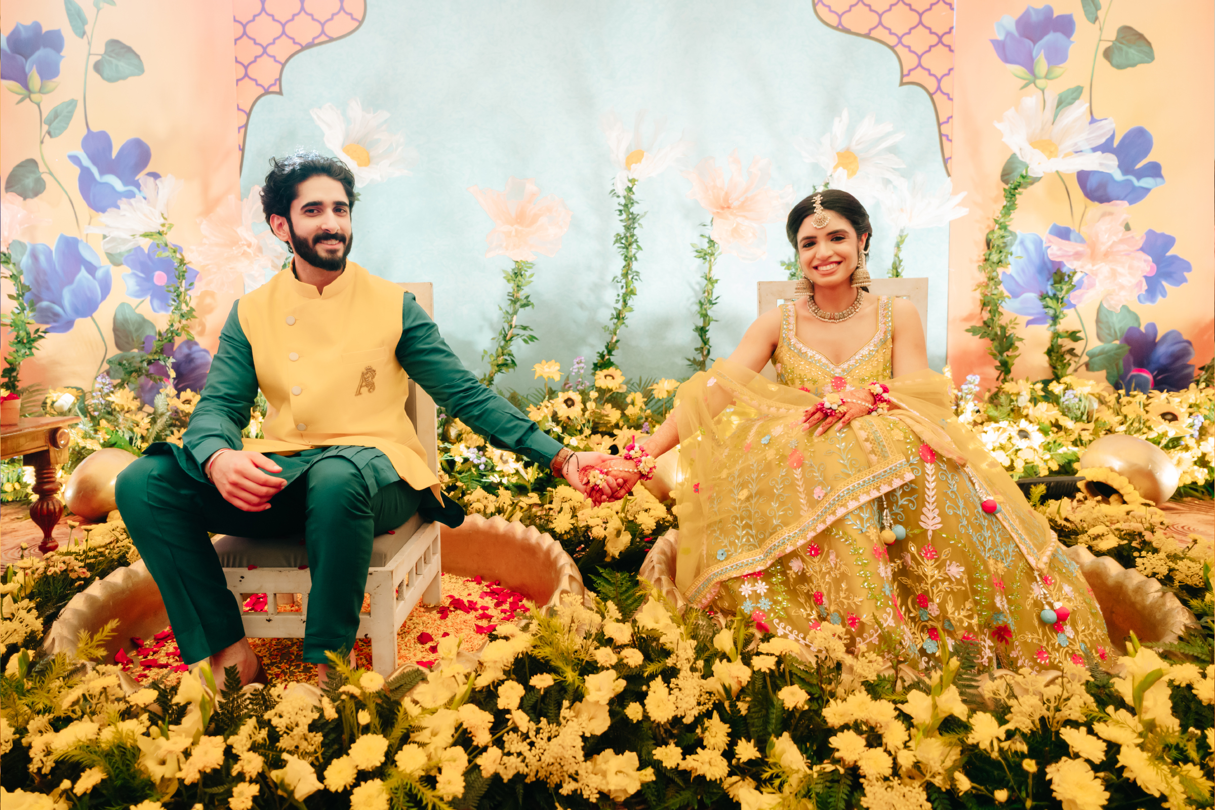 Each celebration felt like a vibrant chapter in their story. The Haldi bloomed in bright yellows and sunflowers with pastel blue backdrops and fuchsia dupatta blessings. The Mehendi followed with an intimate evening under the stars, where blush, peach, and cream florals paired with gold accents and plush seating created a warm, elegant atmosphere.