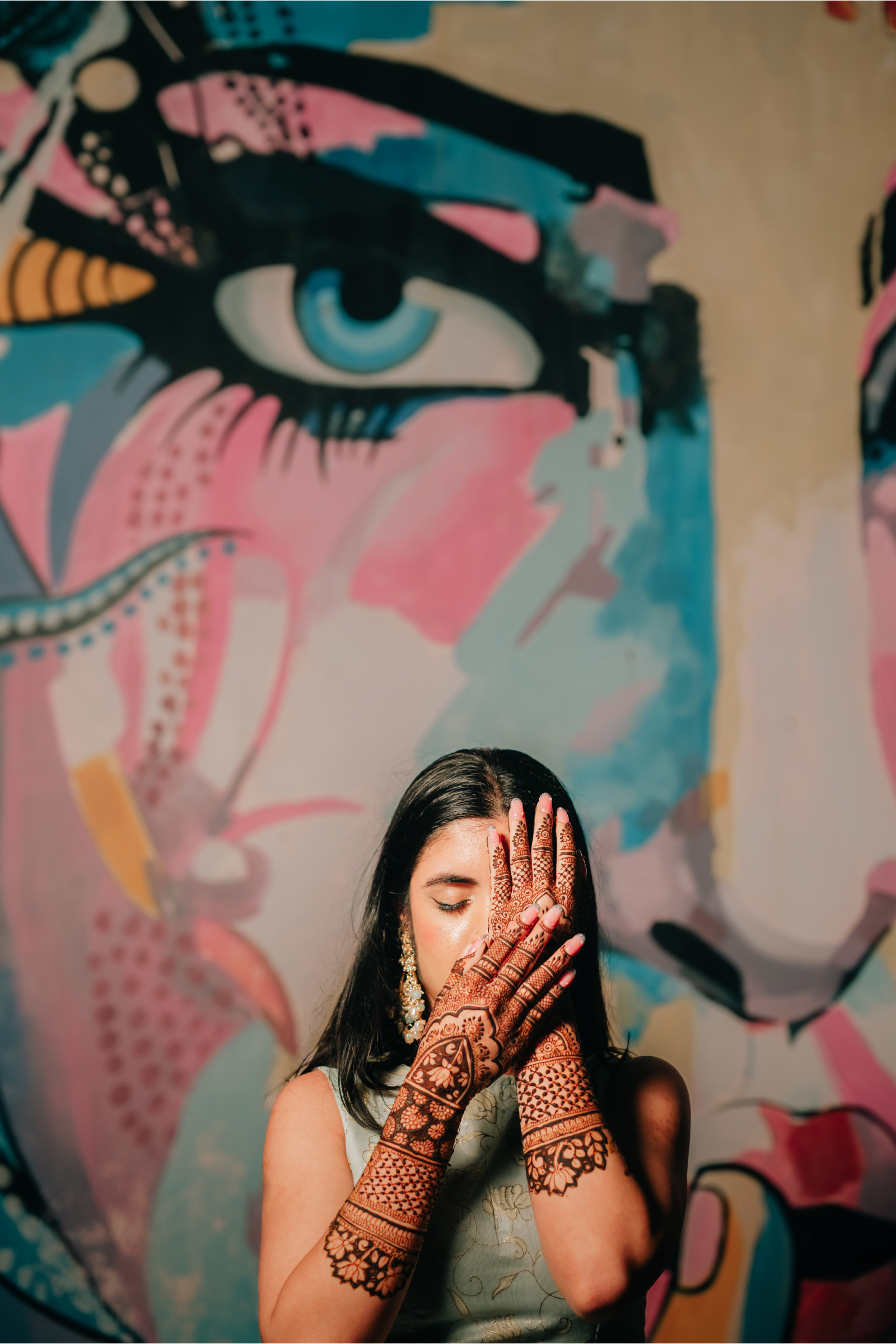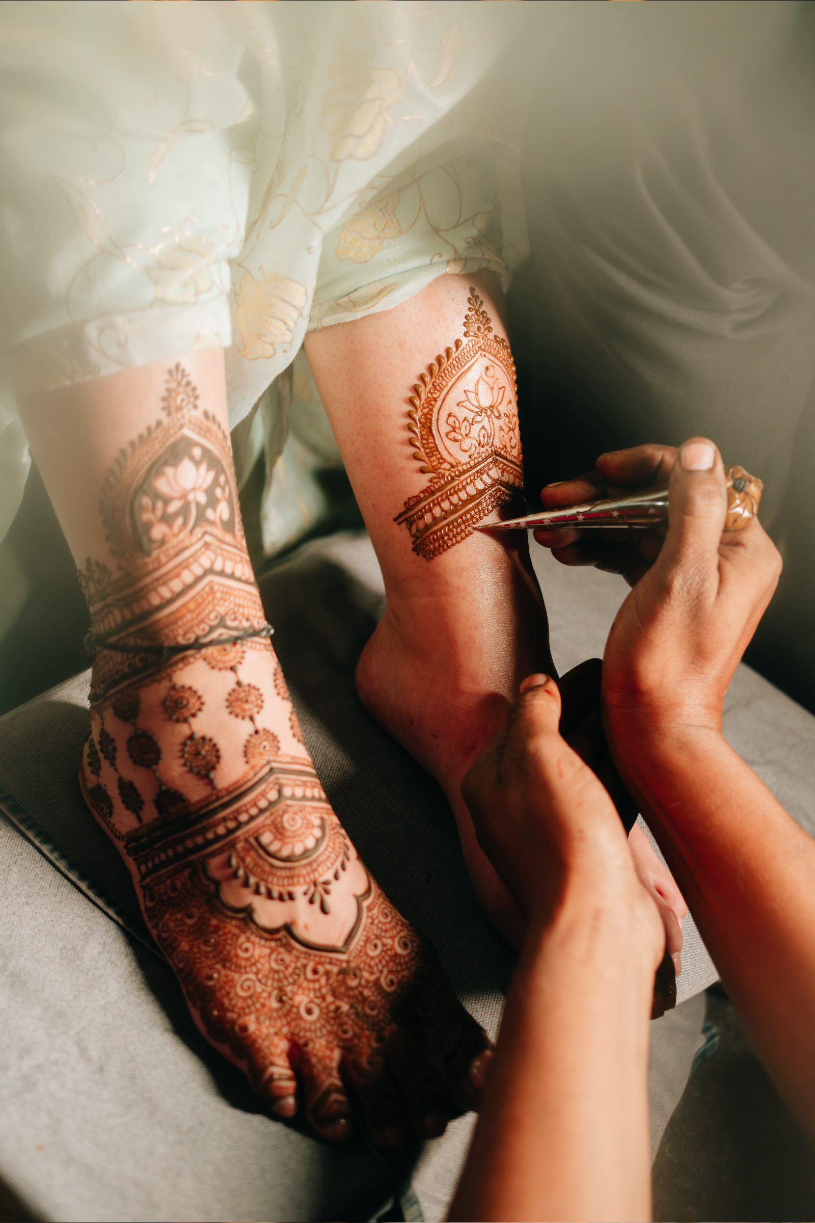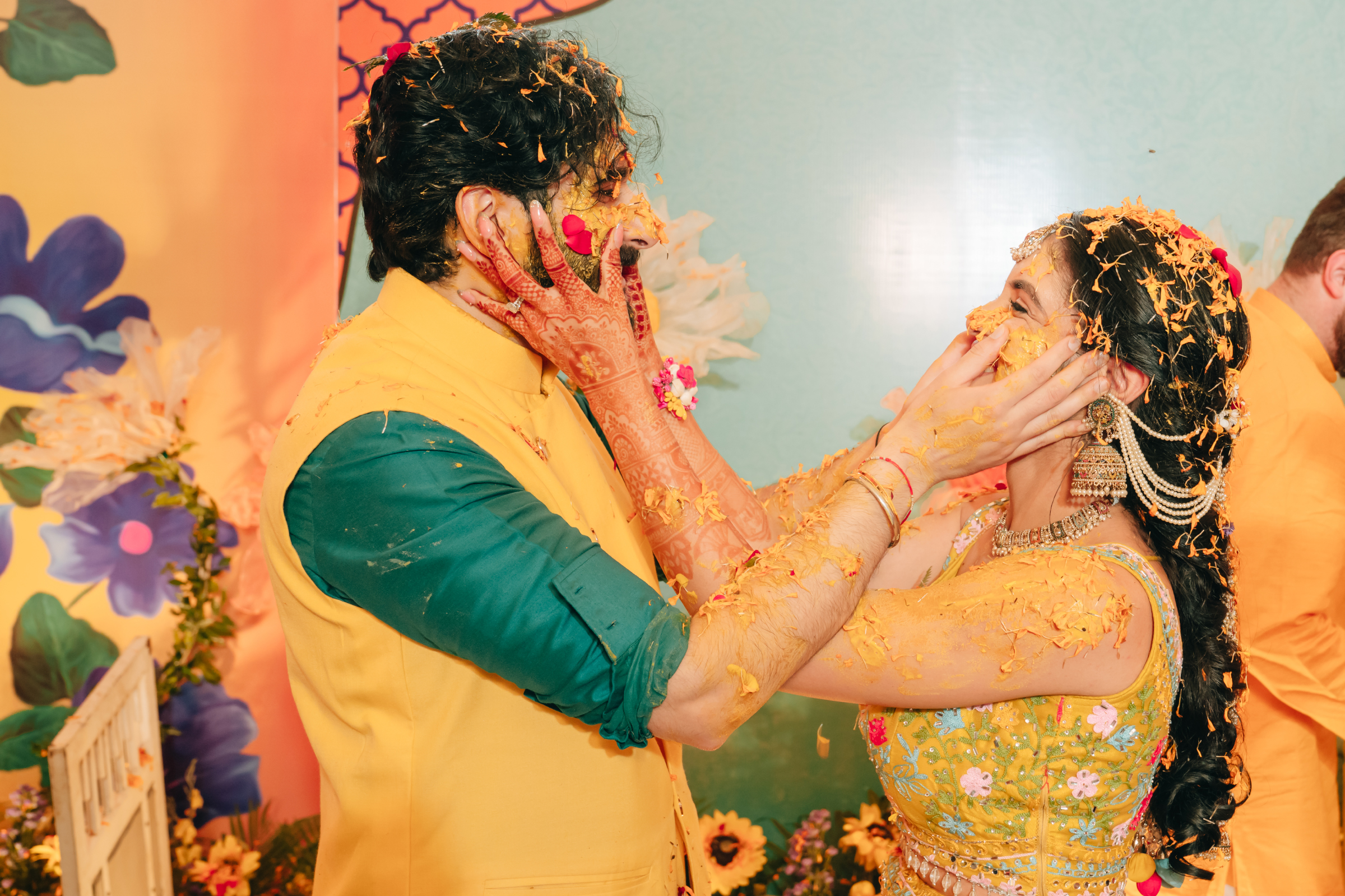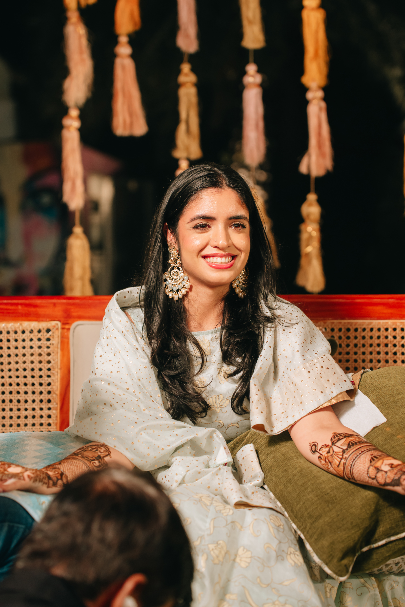 Each celebration felt like a vibrant chapter in their story. The Haldi bloomed in bright yellows and sunflowers with pastel blue backdrops and fuchsia dupatta blessings. The Mehendi followed with an intimate evening under the stars, where blush, peach, and cream florals paired with gold accents and plush seating created a warm, elegant atmosphere.