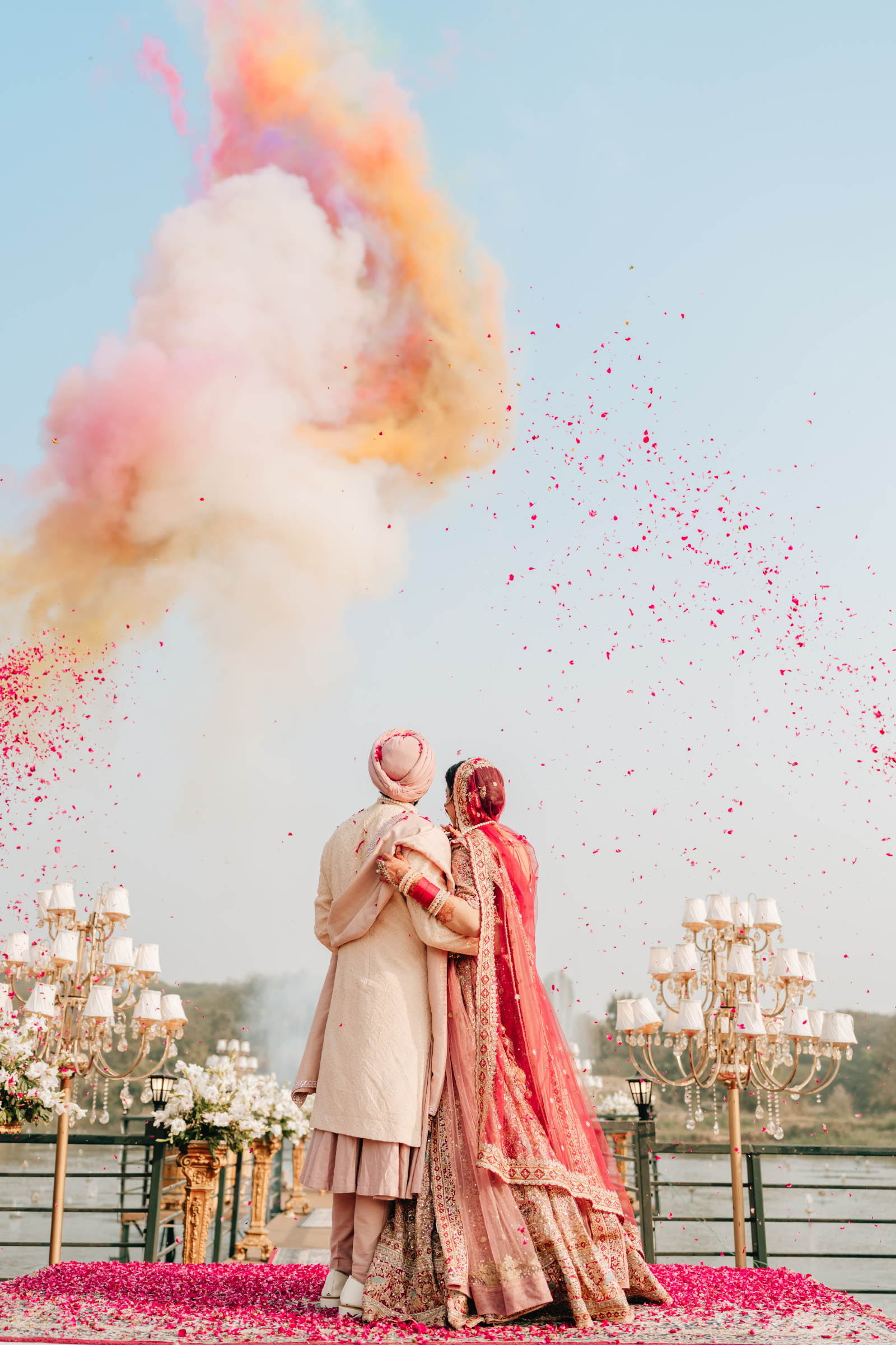 Their wedding ceremony unfolded by the waterfront in serene beauty, framed by white floral candelabras, soft pastel hues, and rose petal showers as the couple, dressed in coral and pink, exchanged vows in a moment of quiet magic.