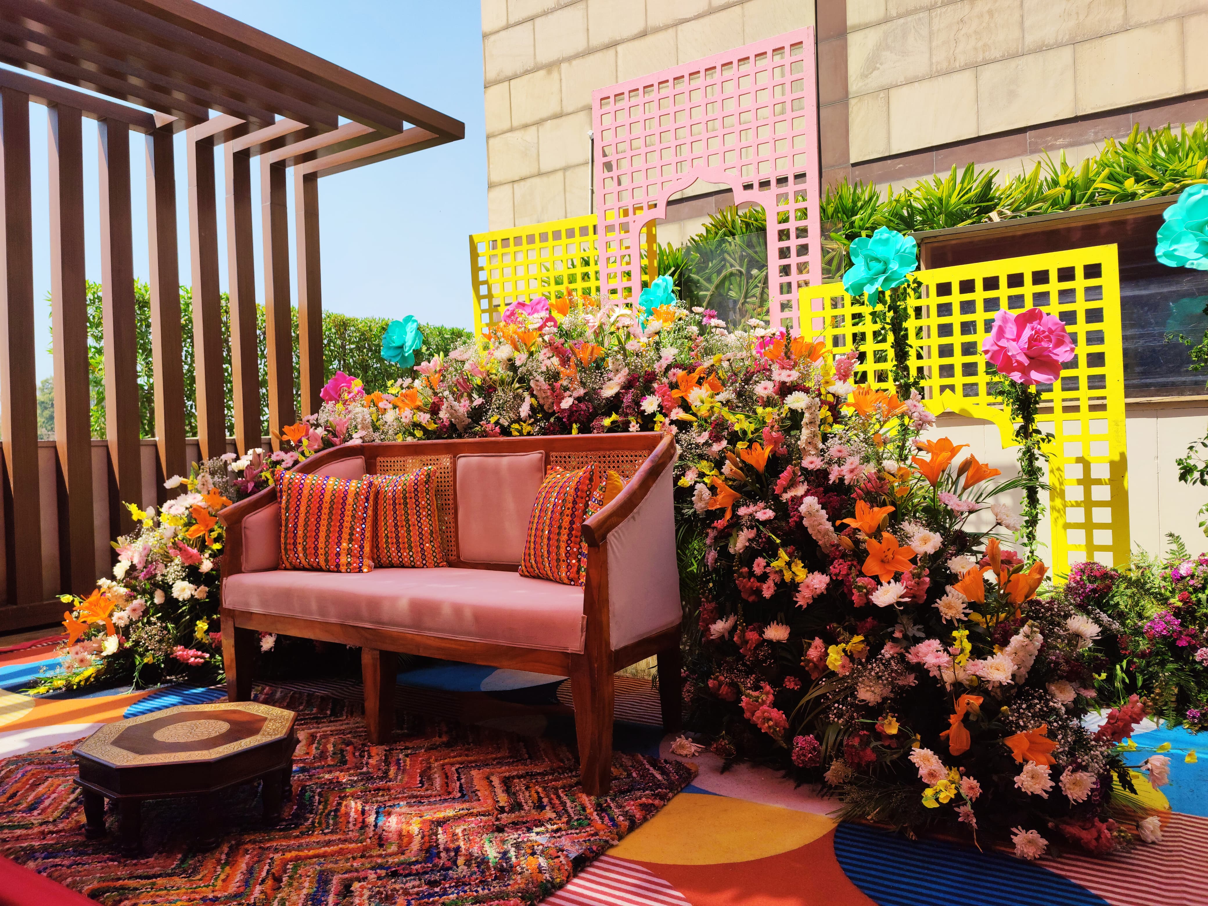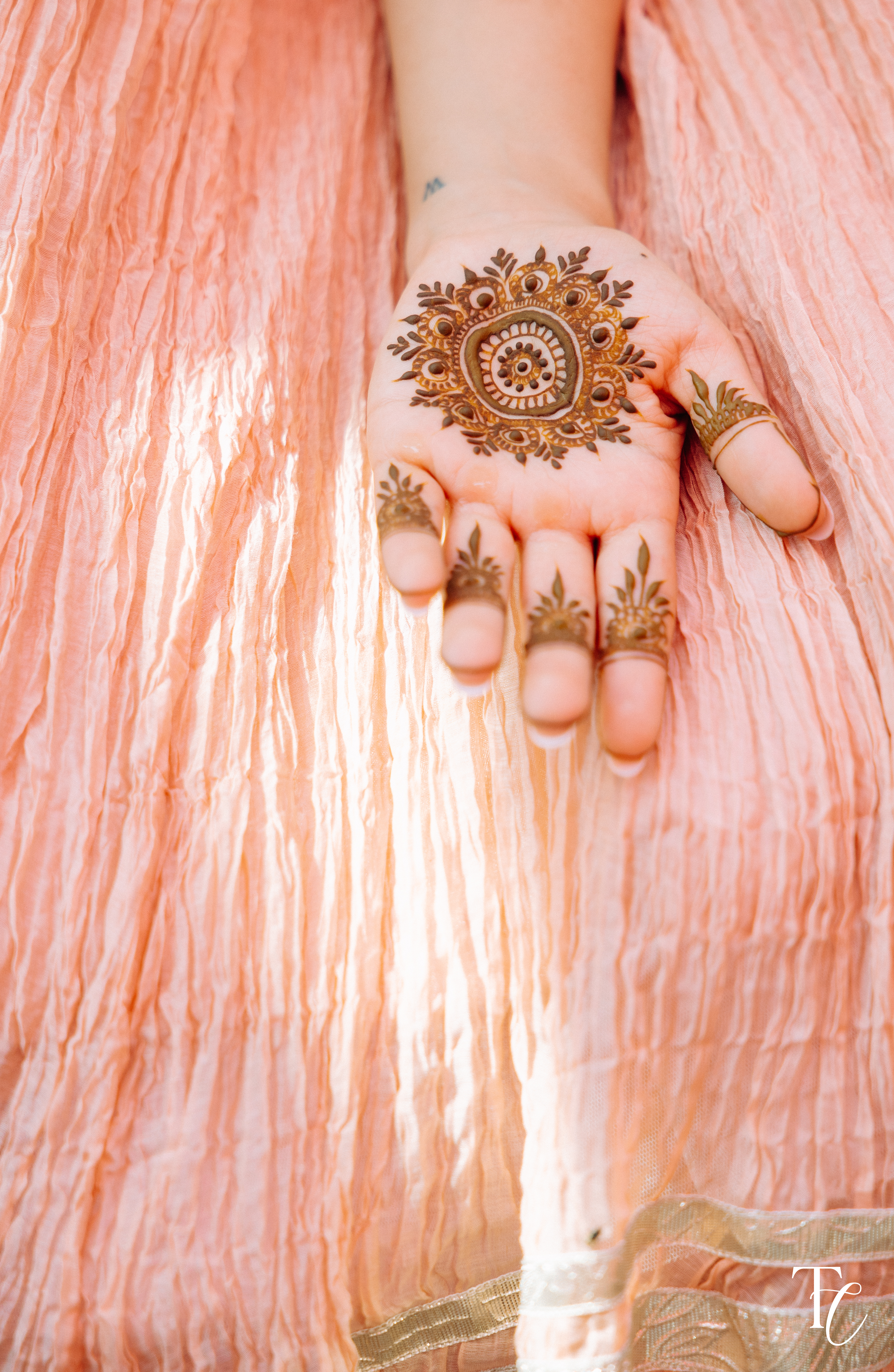 Under a bright, cheerful sky, the Mehndi bloomed with color, music, and joy. Friends and family surrounded Raveena and Michael as intricate henna designs came to life, each swirl telling a story. The air was alive with folk tunes, happy chatter, and the soft rustle of vibrant fabrics – a celebration painted in sunshine and smiles.