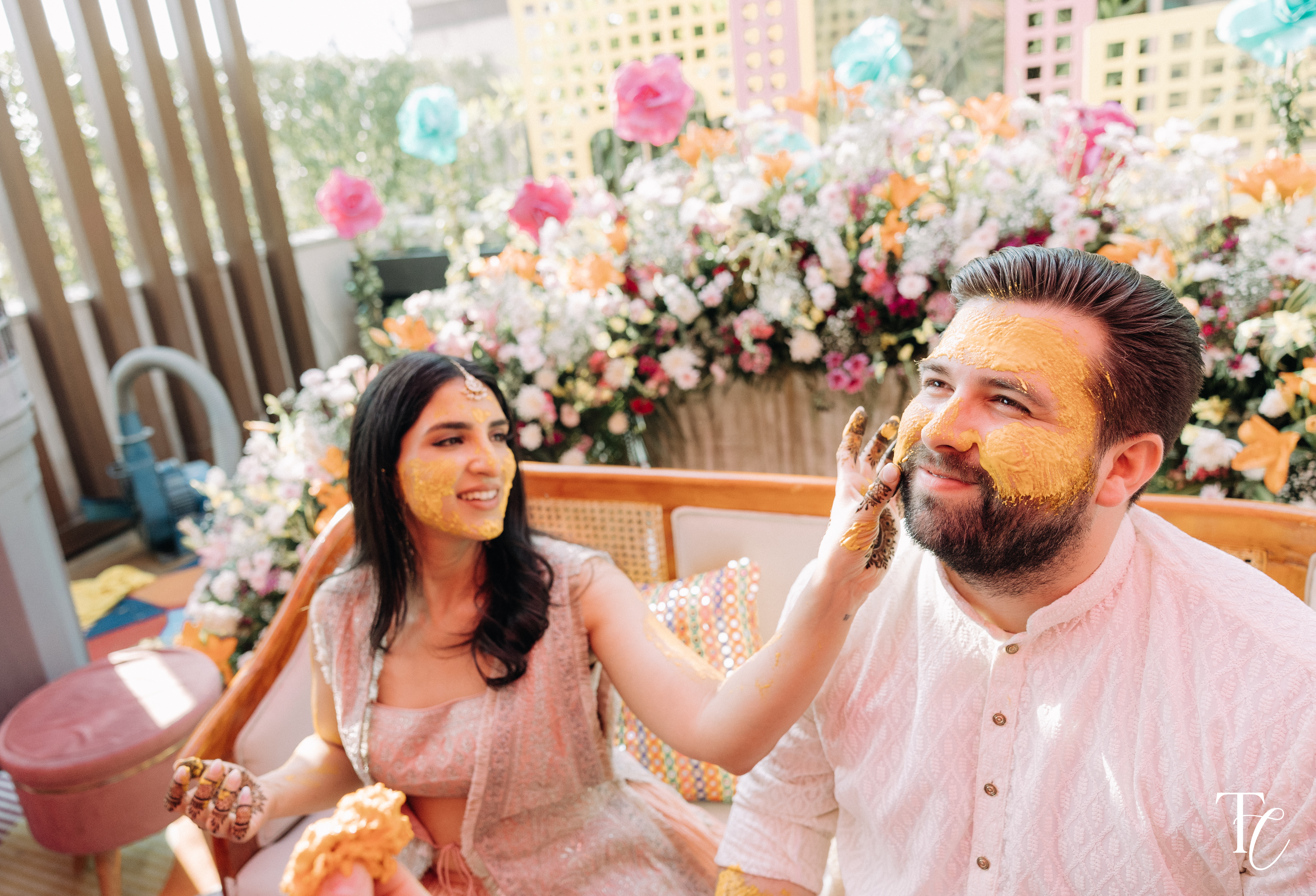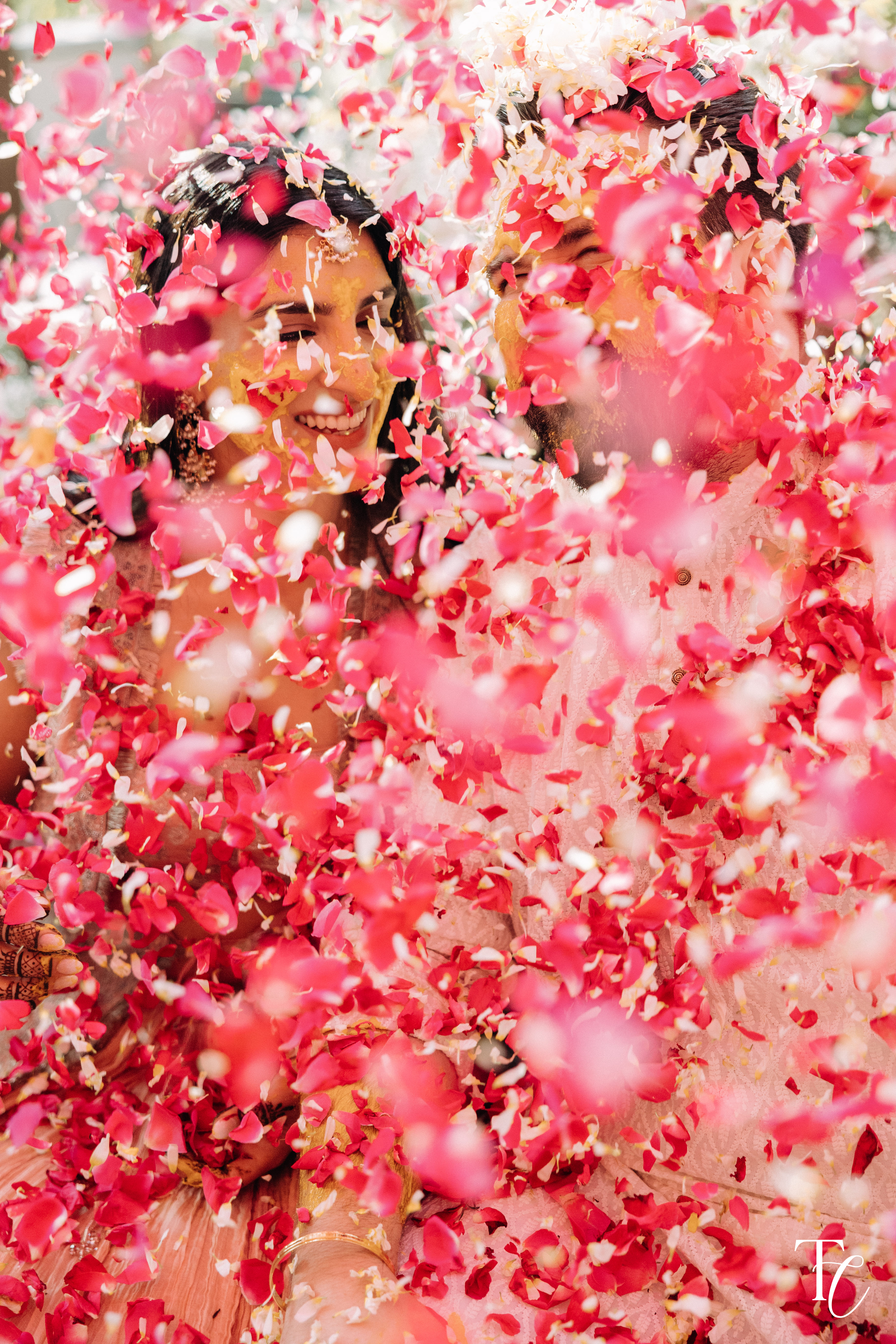 Raveena and Michael’s Haldi was drenched in sunshine and golden laughter. Friends and family gathered to splash colors of joy, smear love in shades of turmeric, and share moments that were as warm and glowing as the couple’s smiles. Every beat of the dhol echoed the promise of a love that’s as radiant as the day itself.