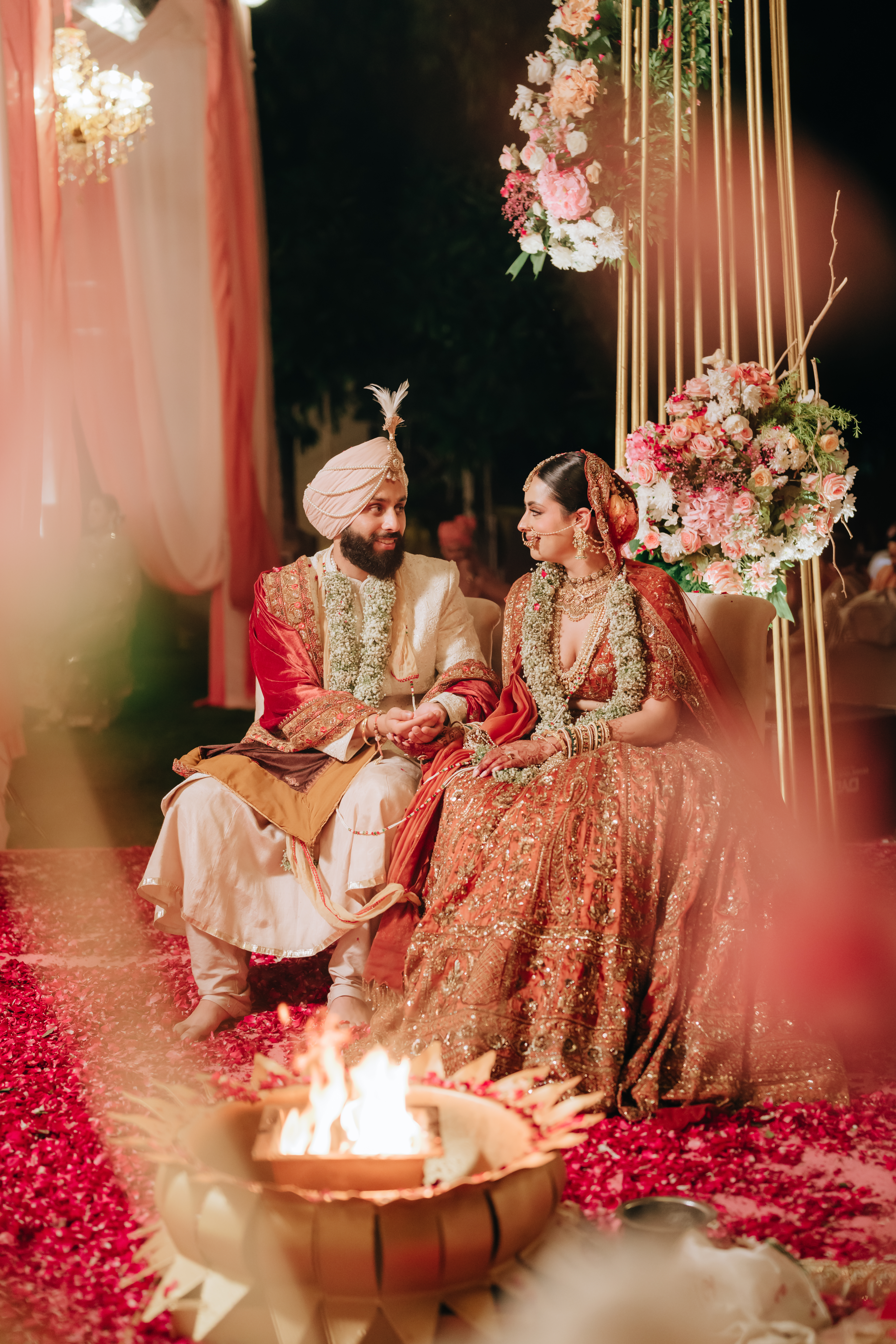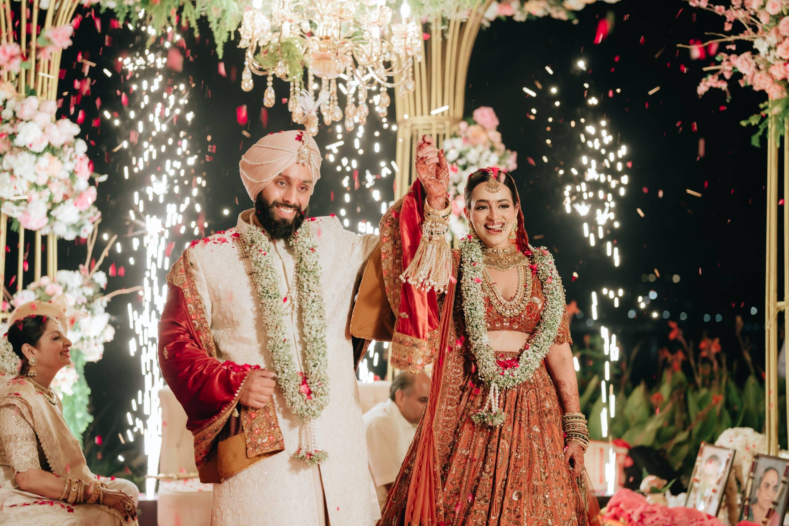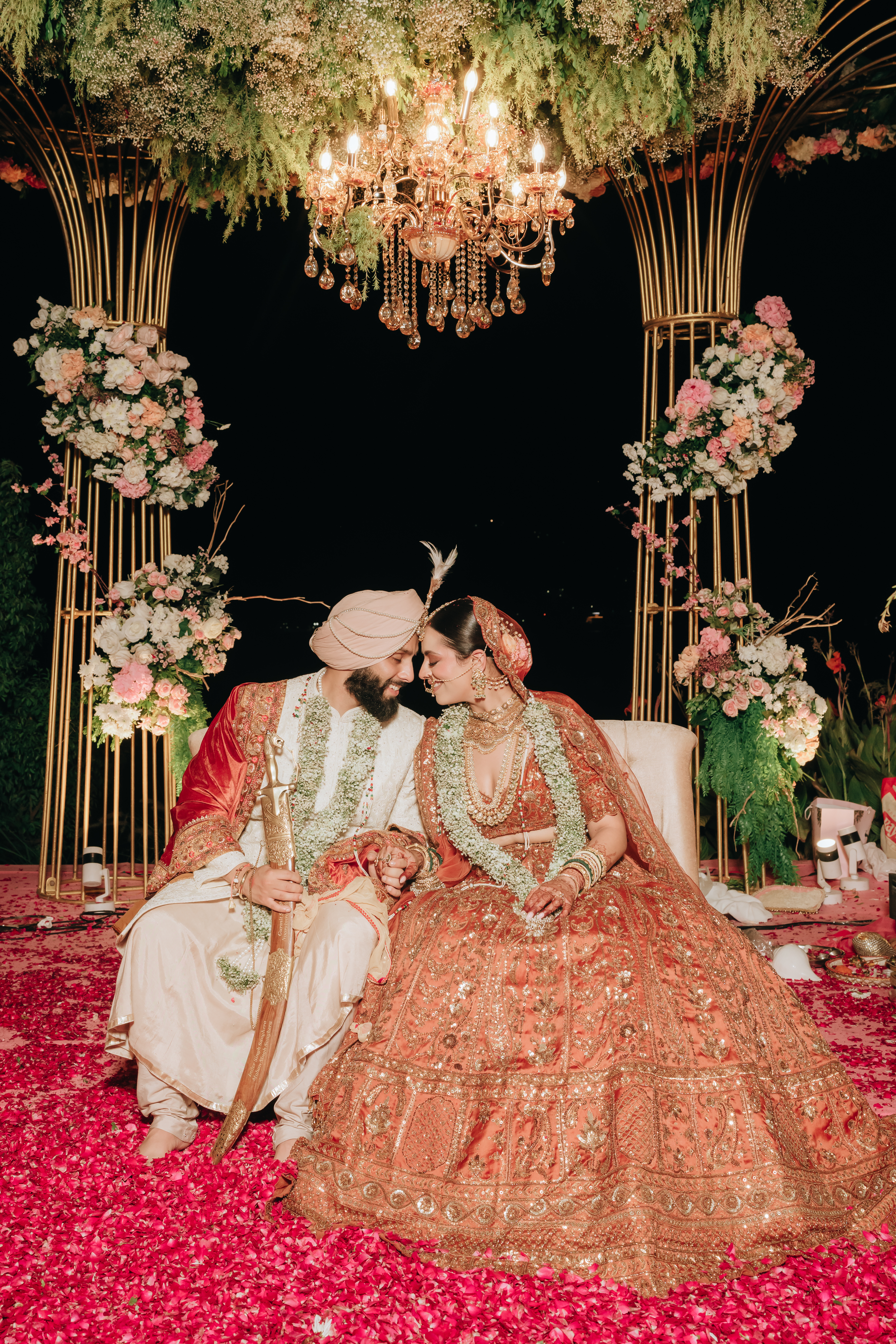 Roshni & Simran’s wedding unfolded in two beautiful chapters. The day began in the serene sanctity of the gurdwara, where their Anand Karaj felt as personal as a prayer – just close family, sacred vows, and an atmosphere wrapped in warmth and quiet joy. Every glance, every smile carried the grace of a love rooted in meaning.