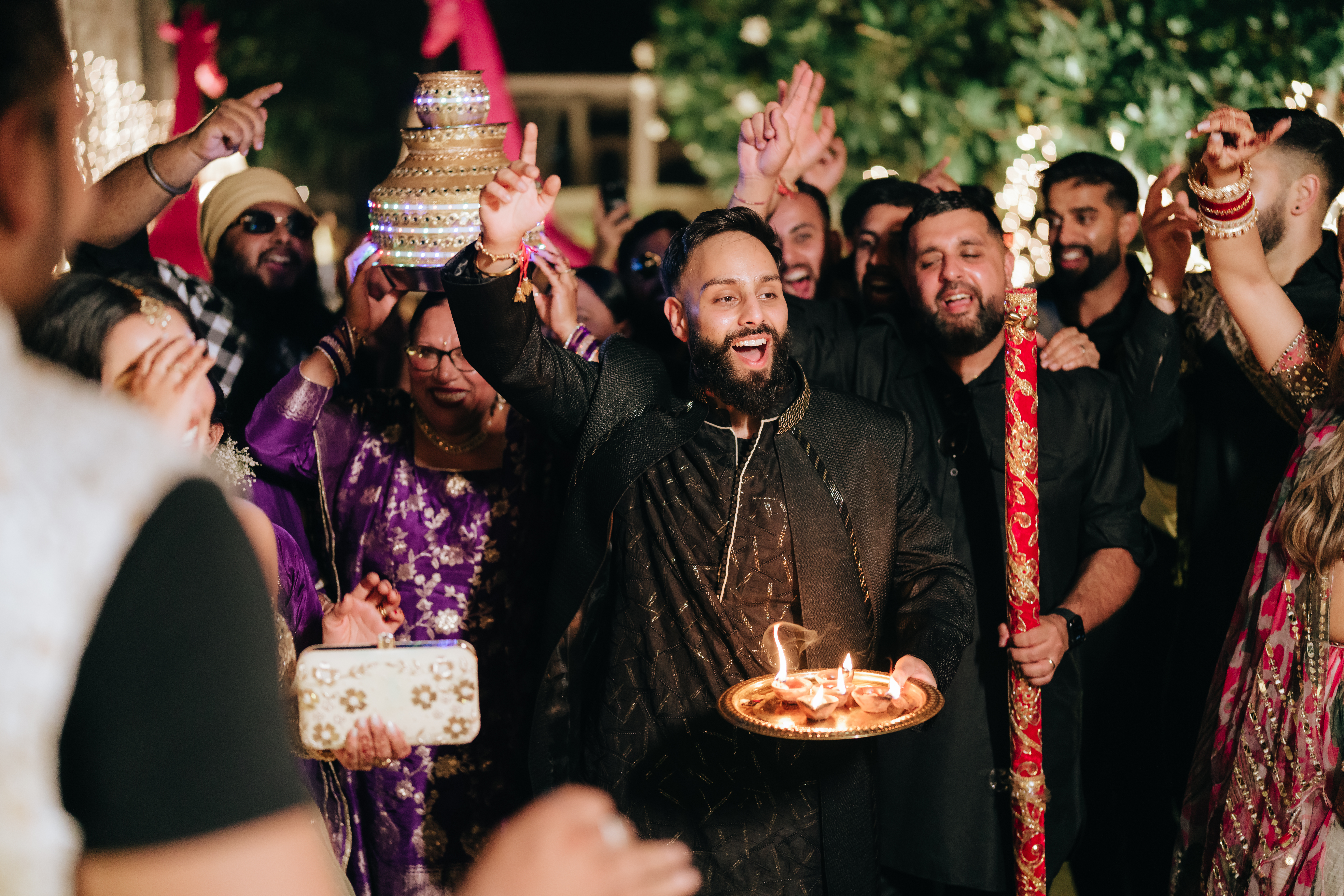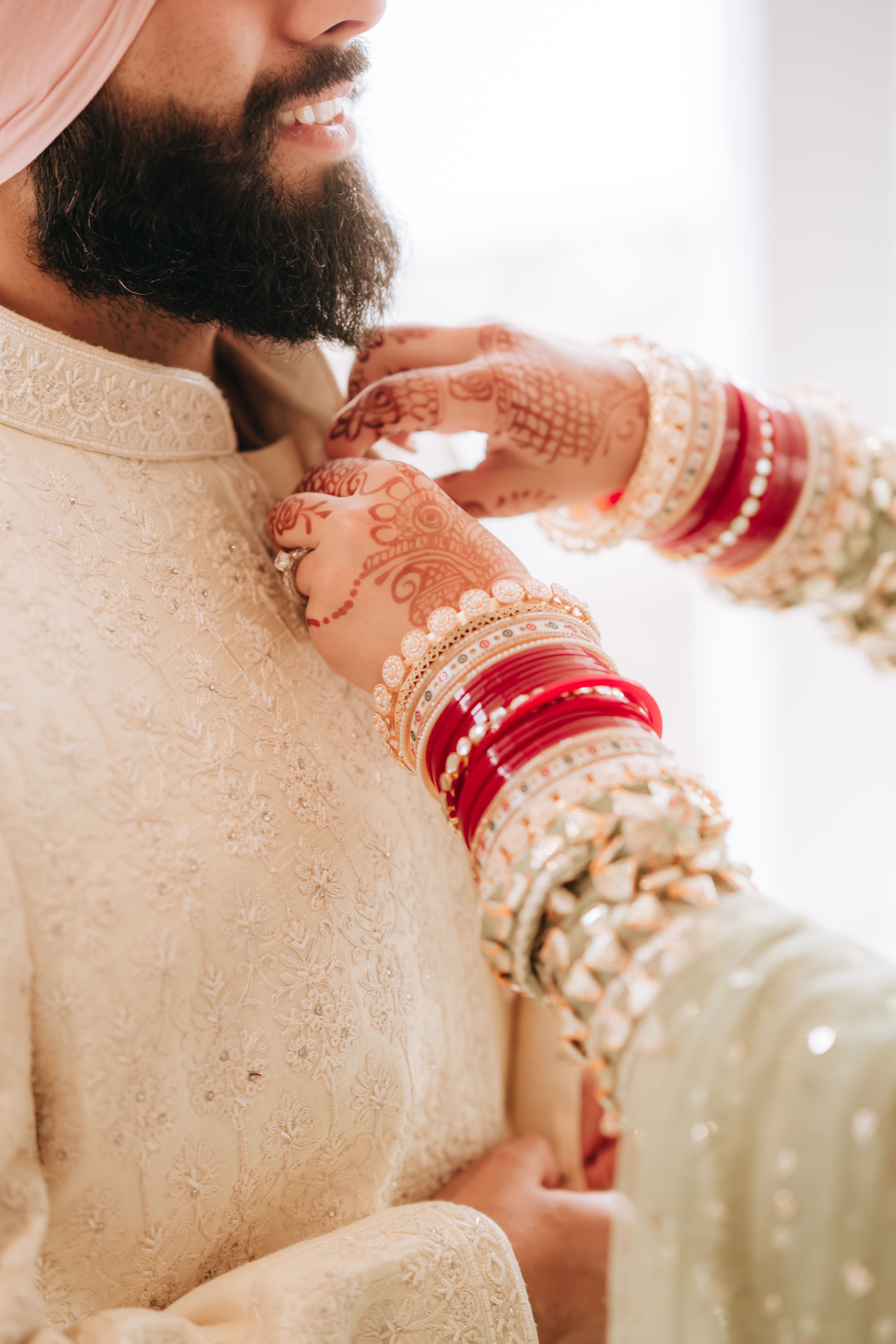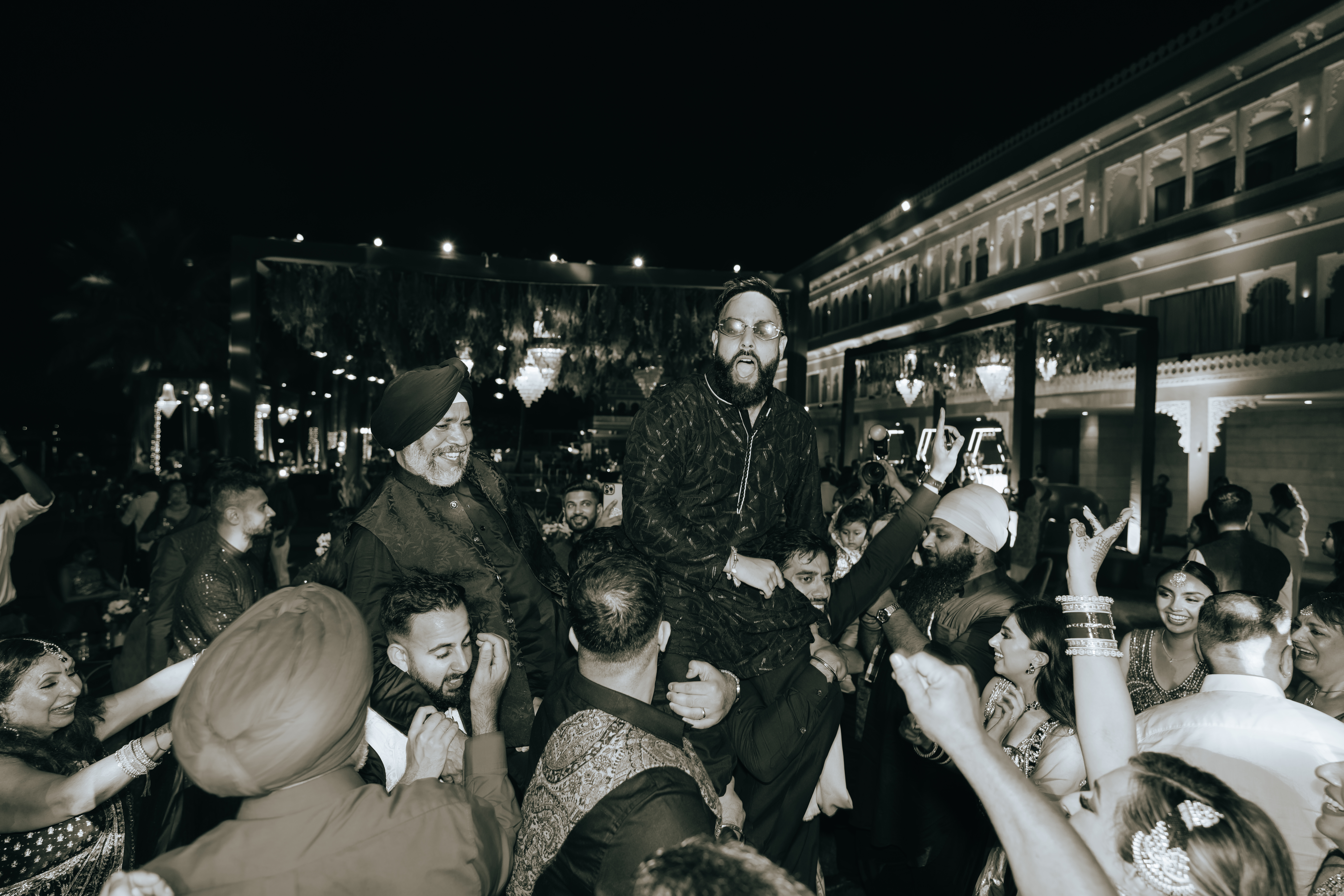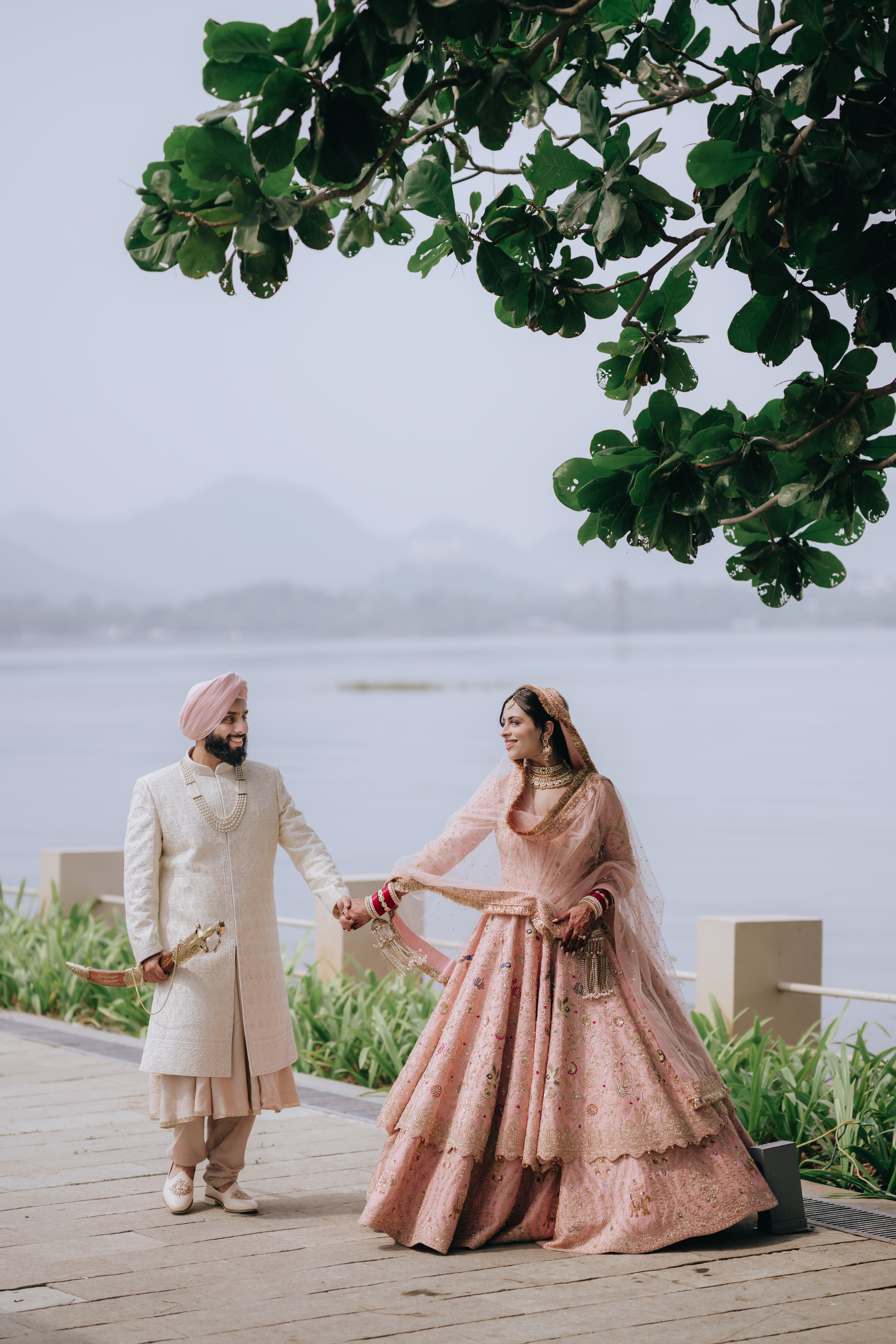 Roshni & Simran’s wedding unfolded in two beautiful chapters. The day began in the serene sanctity of the gurdwara, where their Anand Karaj felt as personal as a prayer – just close family, sacred vows, and an atmosphere wrapped in warmth and quiet joy. Every glance, every smile carried the grace of a love rooted in meaning.