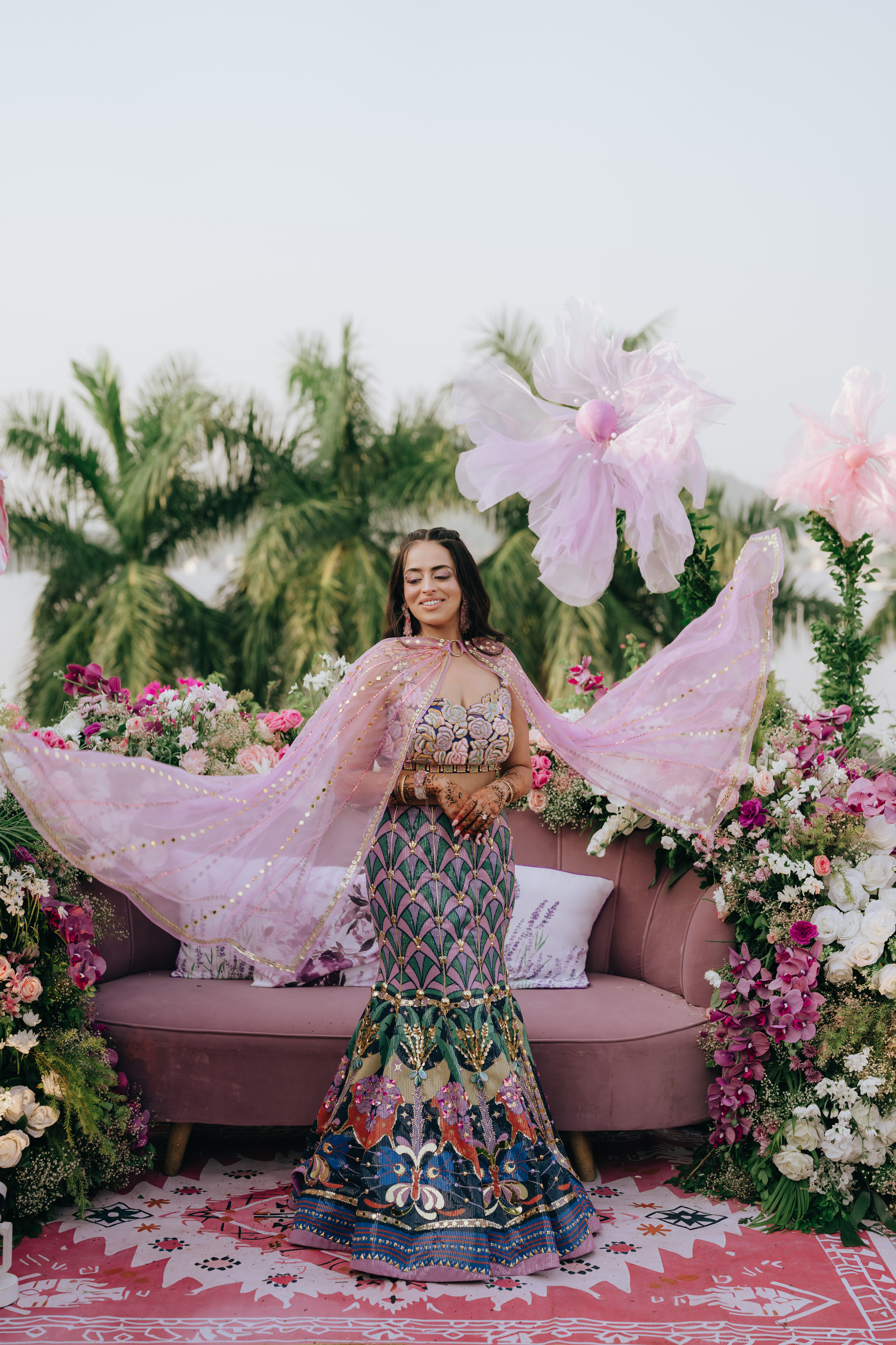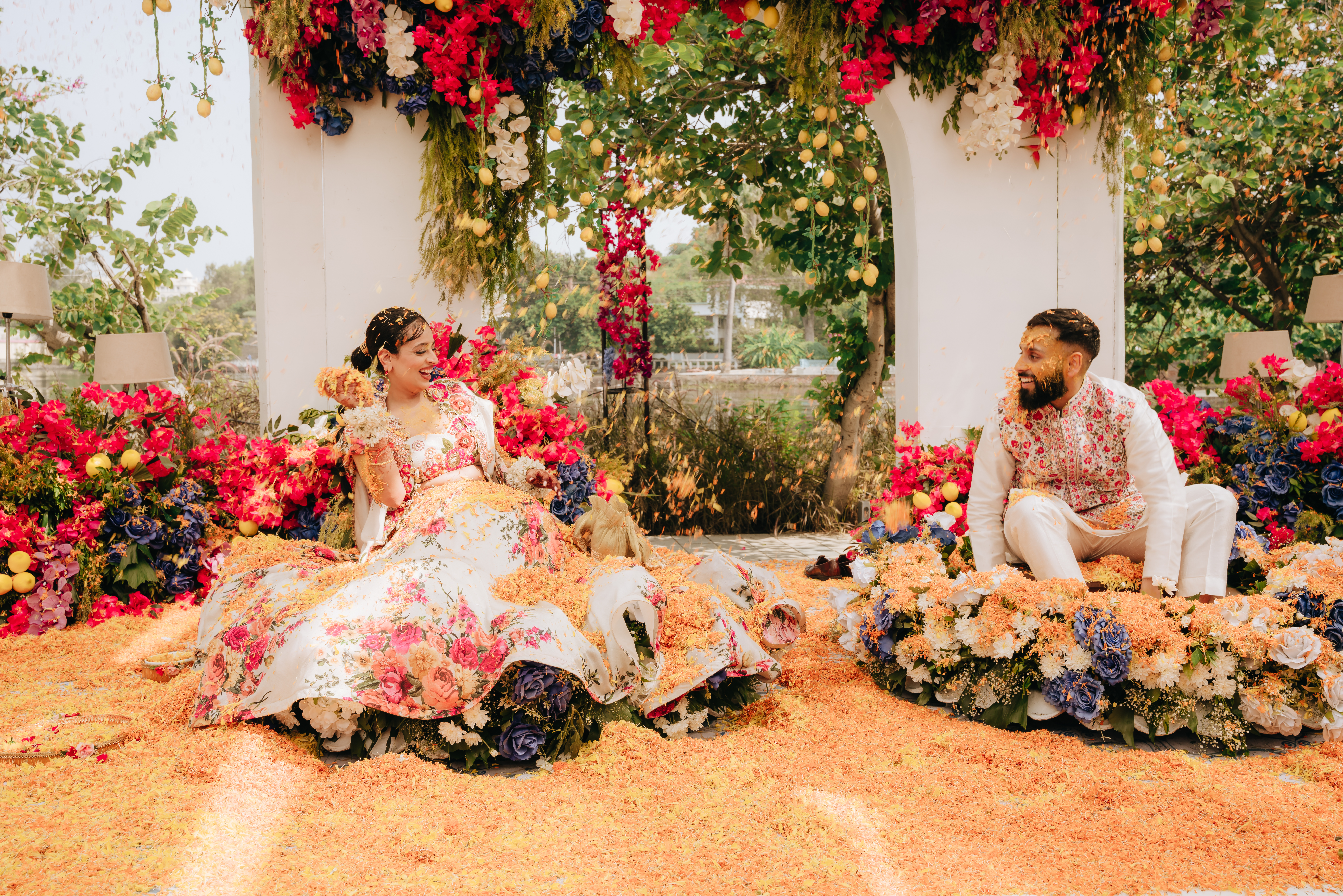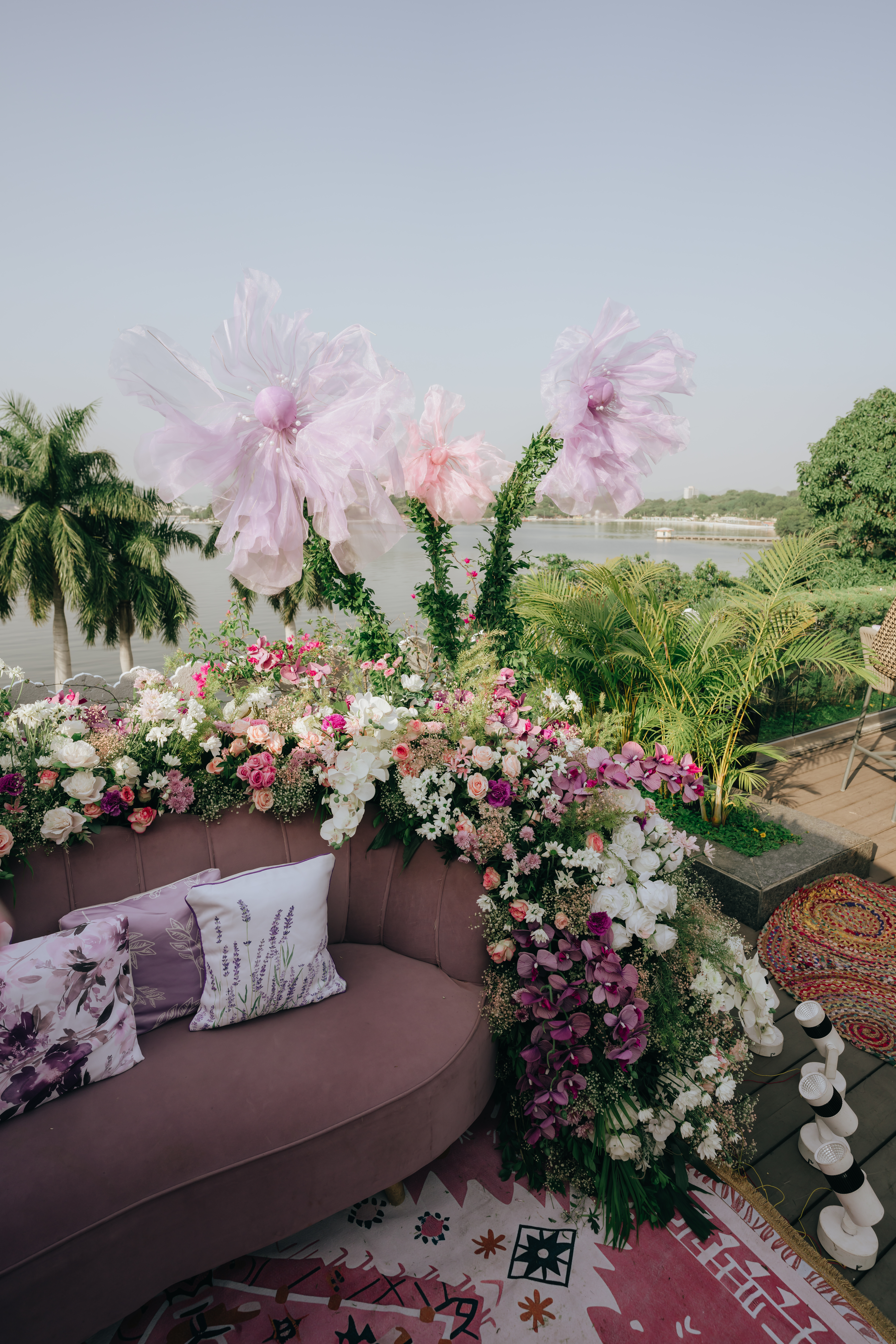 The mehndi bloomed in vibrant garden romance – a palette of blush, lavender, and fuchsia wrapped around the space in lush florals and whimsical oversized blooms. A blush-toned lounge nestled amid cascading flowers created the perfect frame for candid moments, while patterned pink flooring and delicate lavender details brought in playful charm. It was a celebration bathed in colour, joy, and lighthearted elegance.