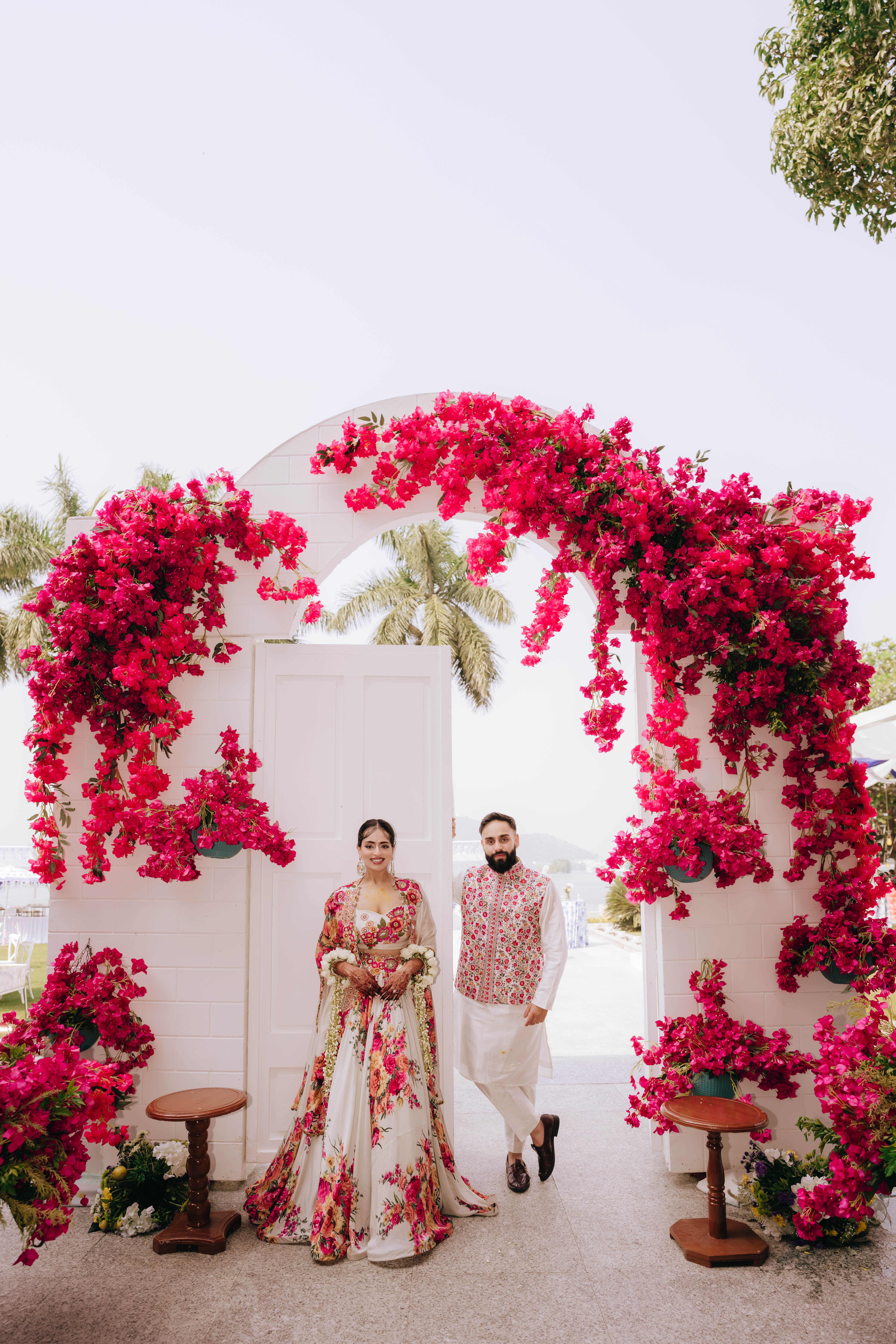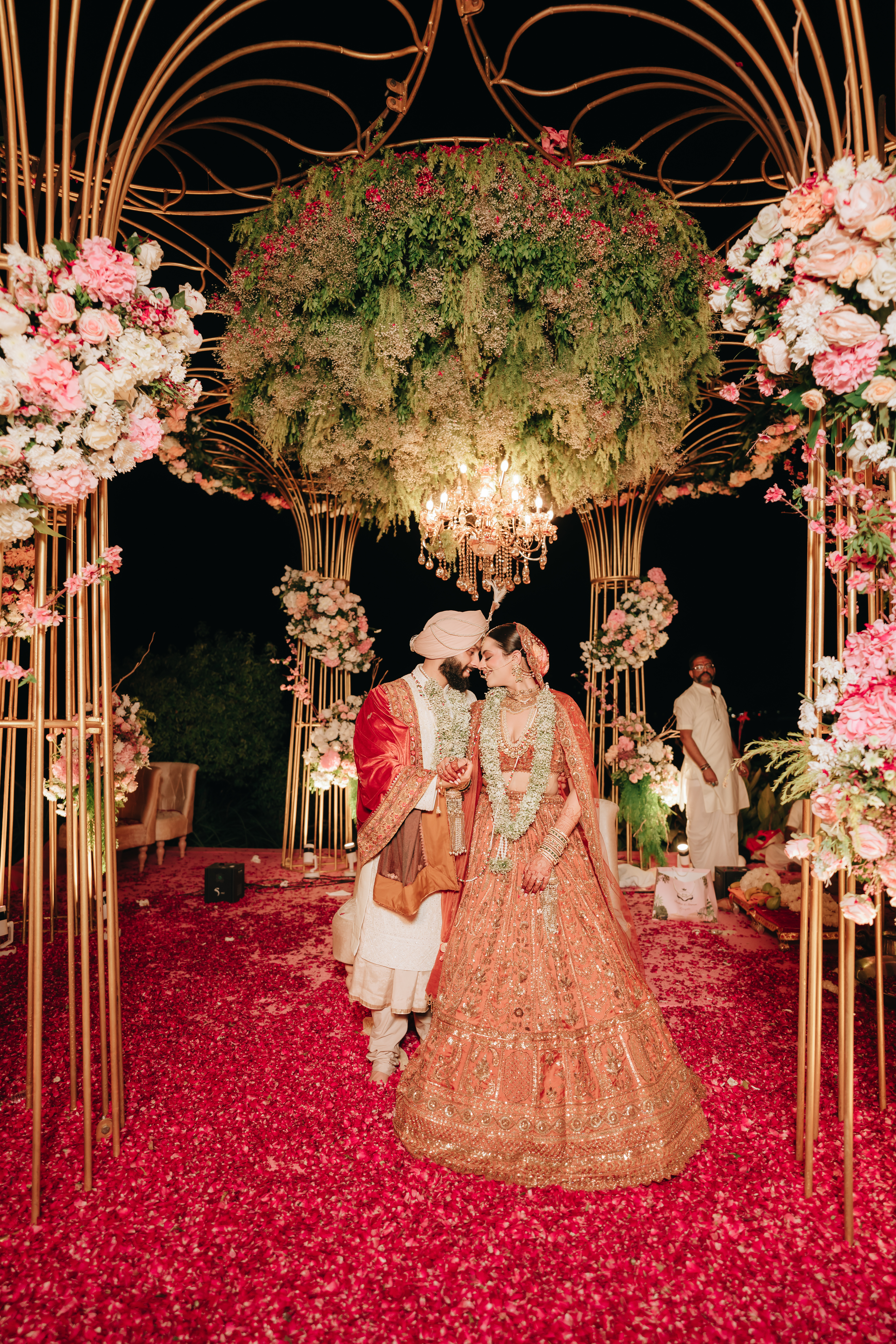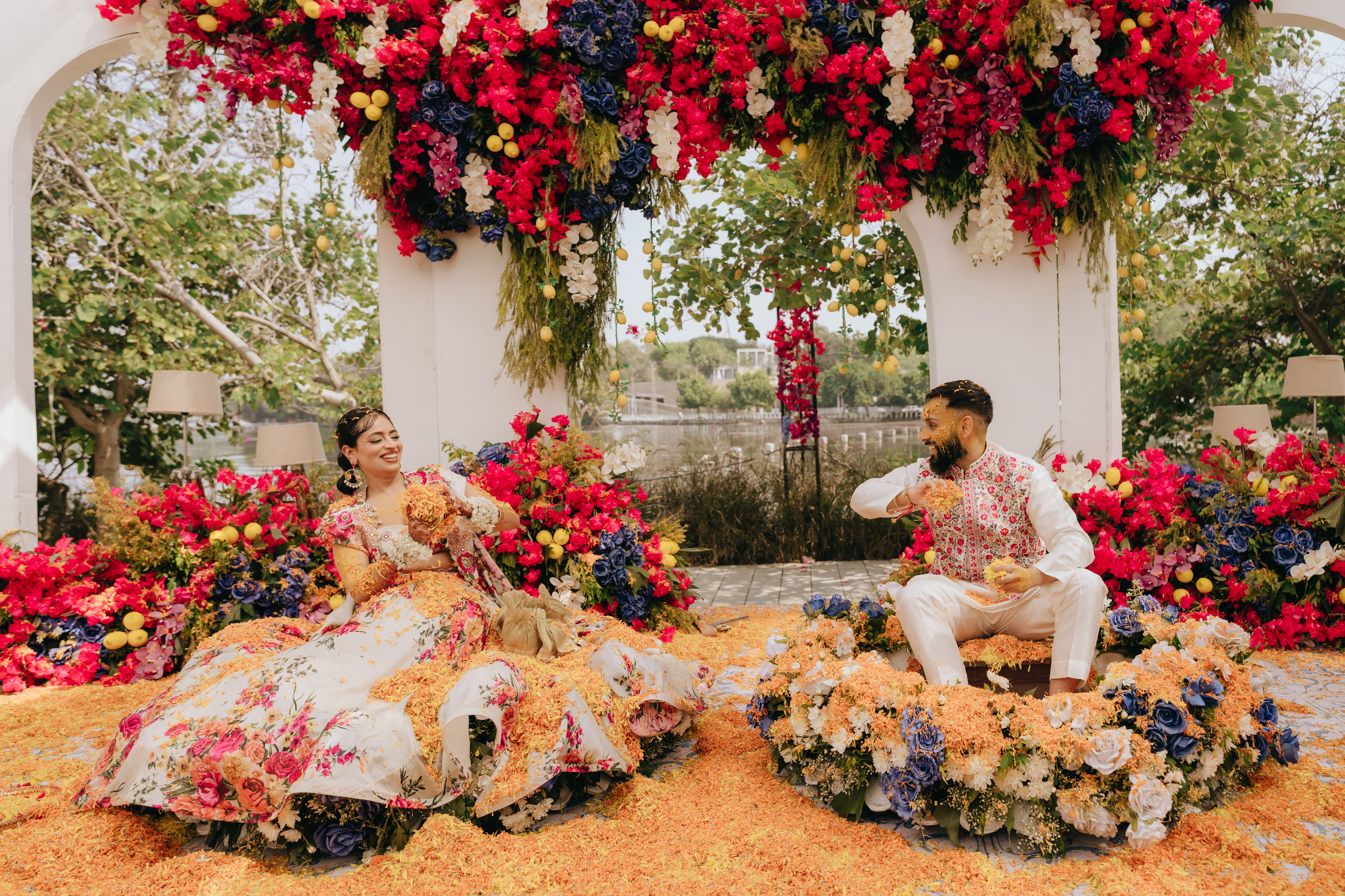 The mehndi bloomed in vibrant garden romance – a palette of blush, lavender, and fuchsia wrapped around the space in lush florals and whimsical oversized blooms. A blush-toned lounge nestled amid cascading flowers created the perfect frame for candid moments, while patterned pink flooring and delicate lavender details brought in playful charm. It was a celebration bathed in colour, joy, and lighthearted elegance.