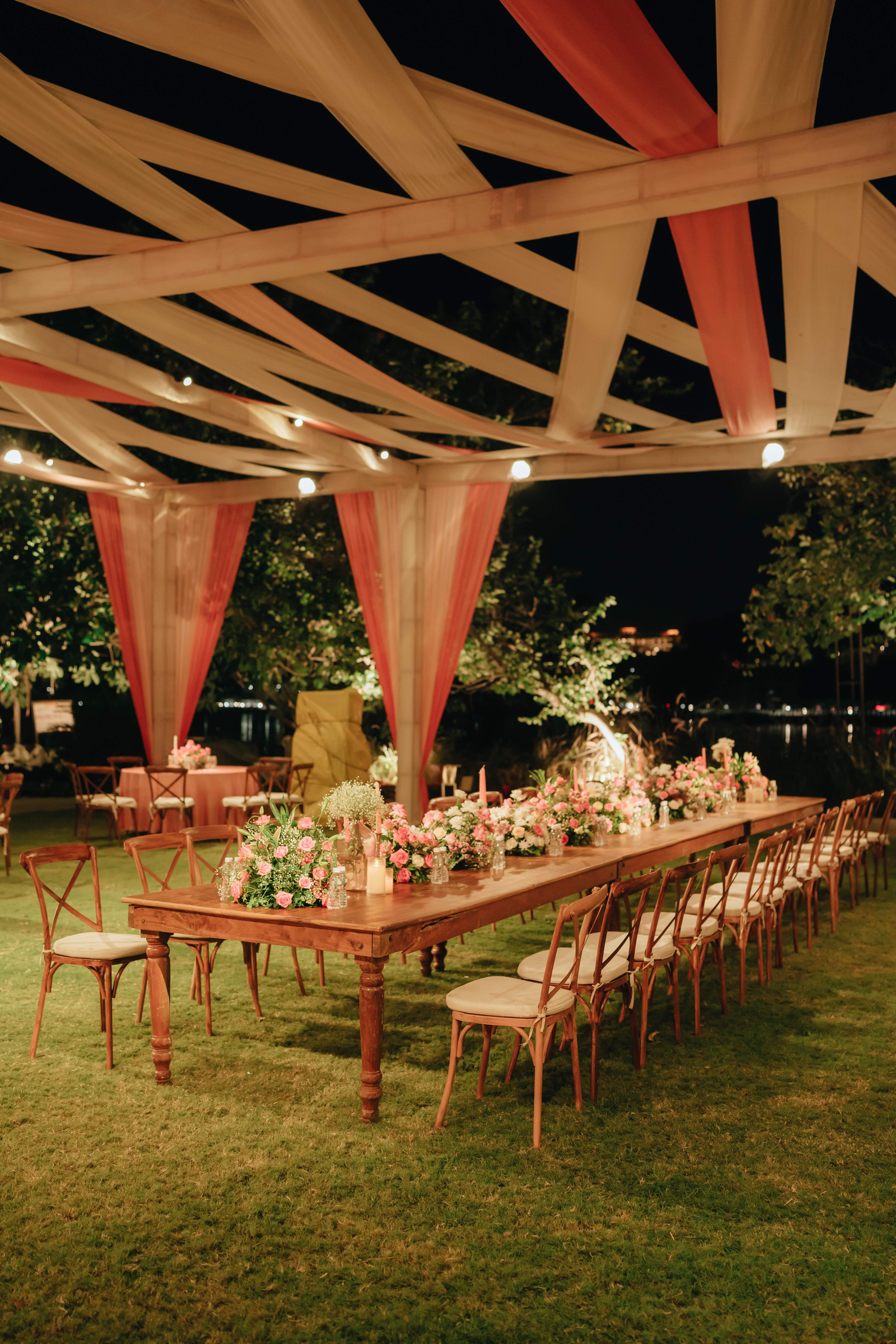 The reception embraced UK-style sophistication, where timeless elegance met lakeside romance. Sleek black linens paired with ivory satin runners created a striking contrast, while dramatic black chairs framed each table with poise. Towering white florals in ornate candelabras added grandeur, and the blush-toned canopy overhead, adorned with chandeliers, bathed the evening in a soft, romantic glow – perfectly mirrored by the serene lake beside it.