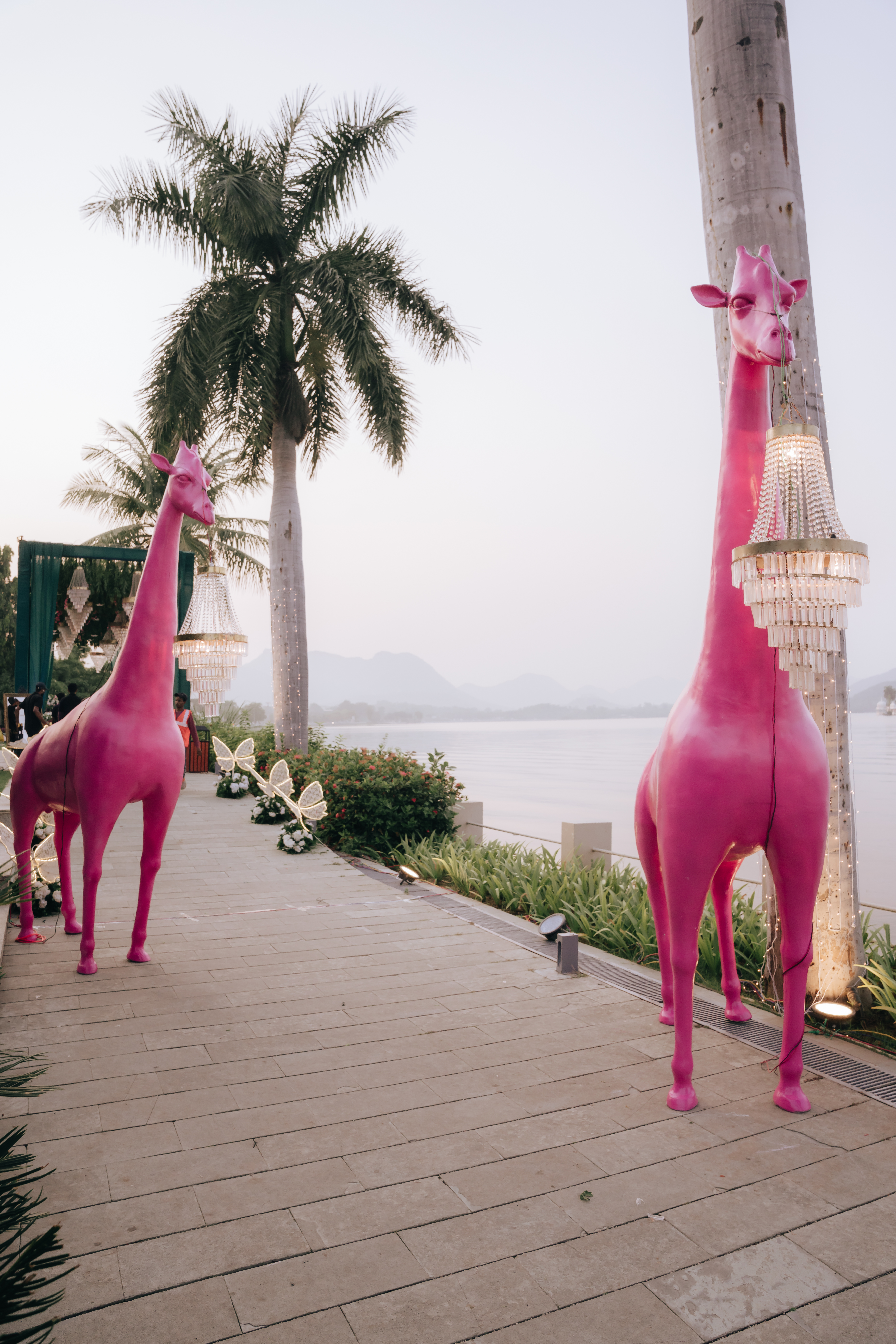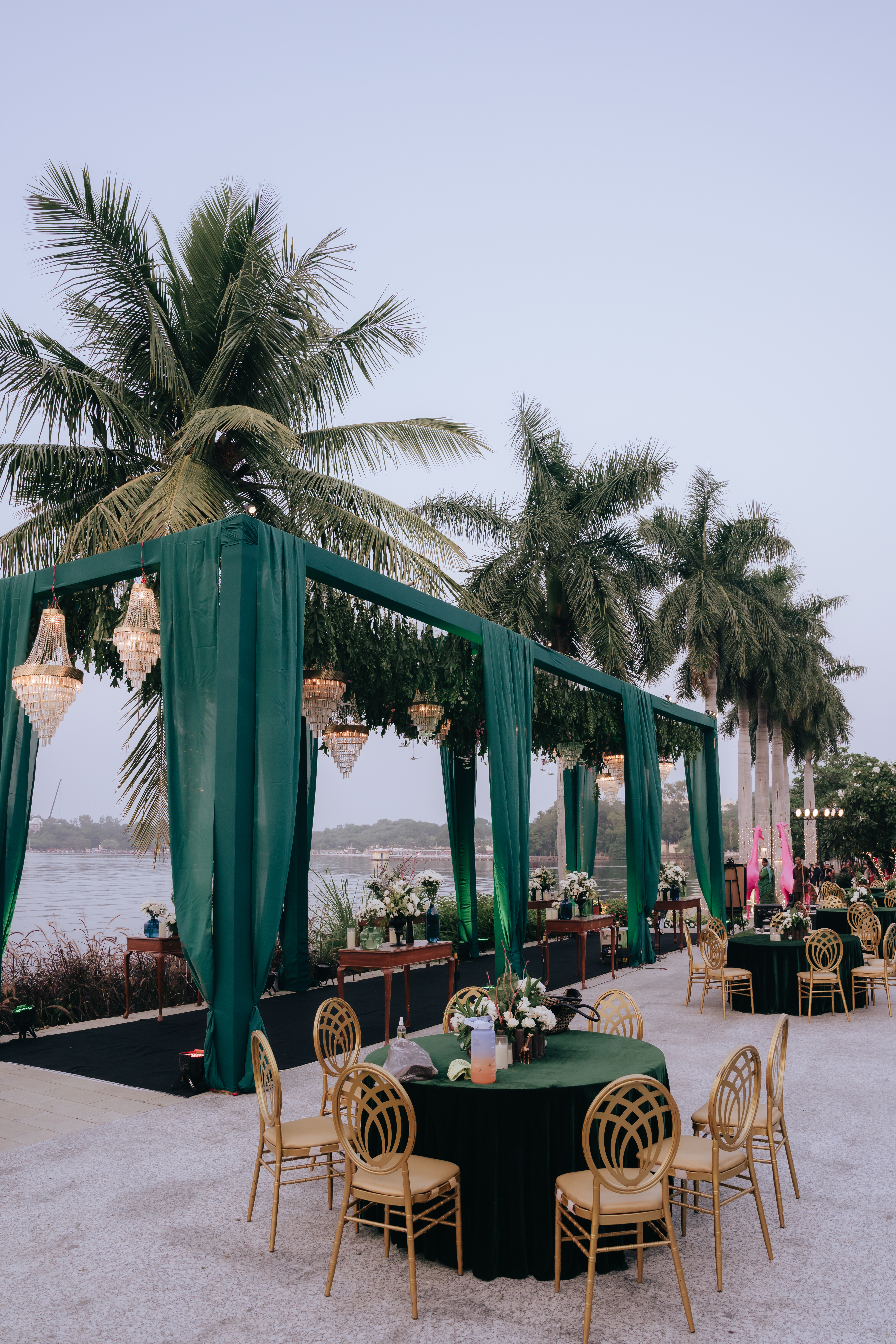 As night fell, the celebration transformed into a fairytale by the lake. Beneath a pastel-draped, golden-arched mandap adorned with intricate sculpted peacocks and cascading blooms, they exchanged garlands. Oversized swaying drapes framed the moment, while warm lights danced on the water – creating the magical, romantic scene they had always envisioned.
