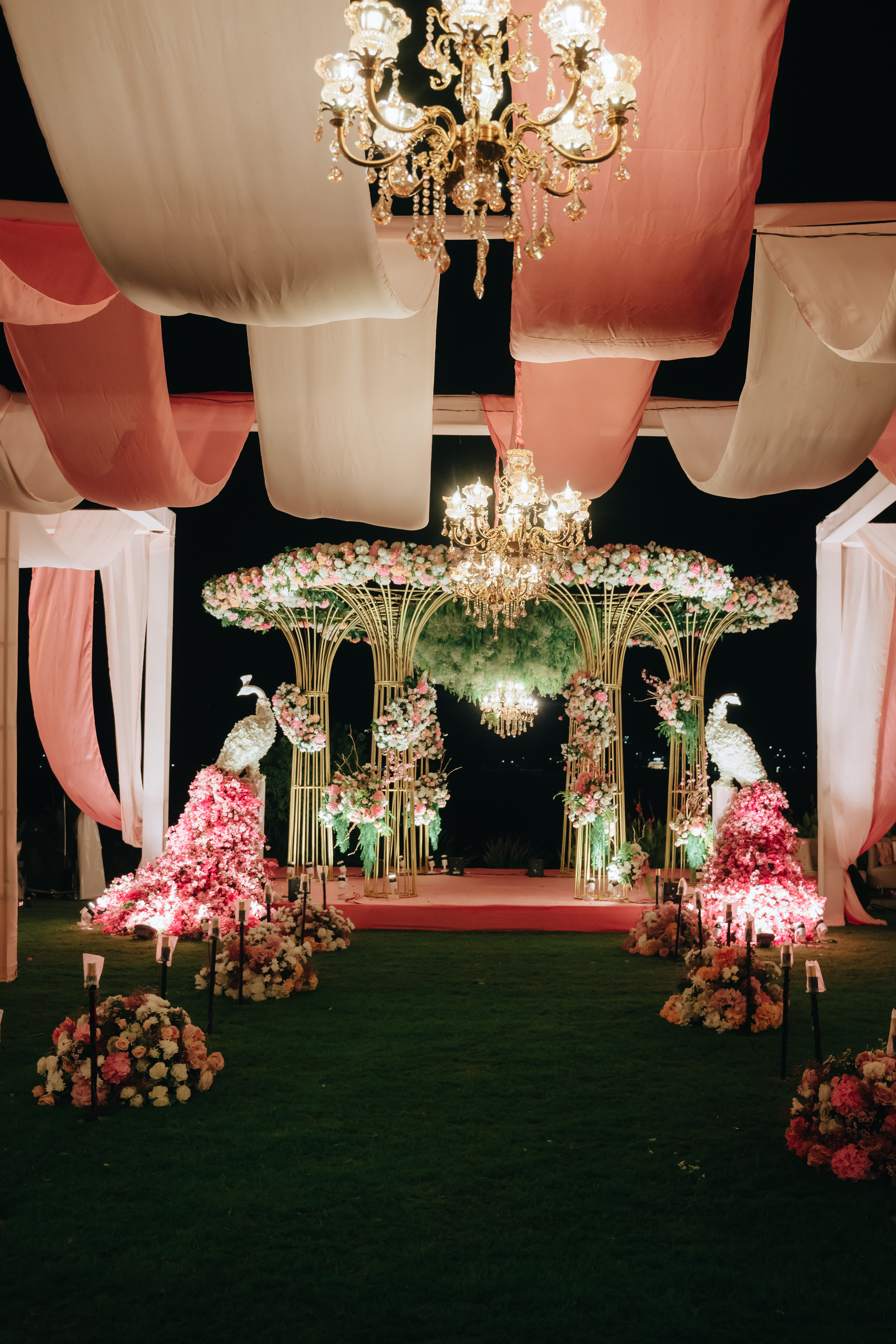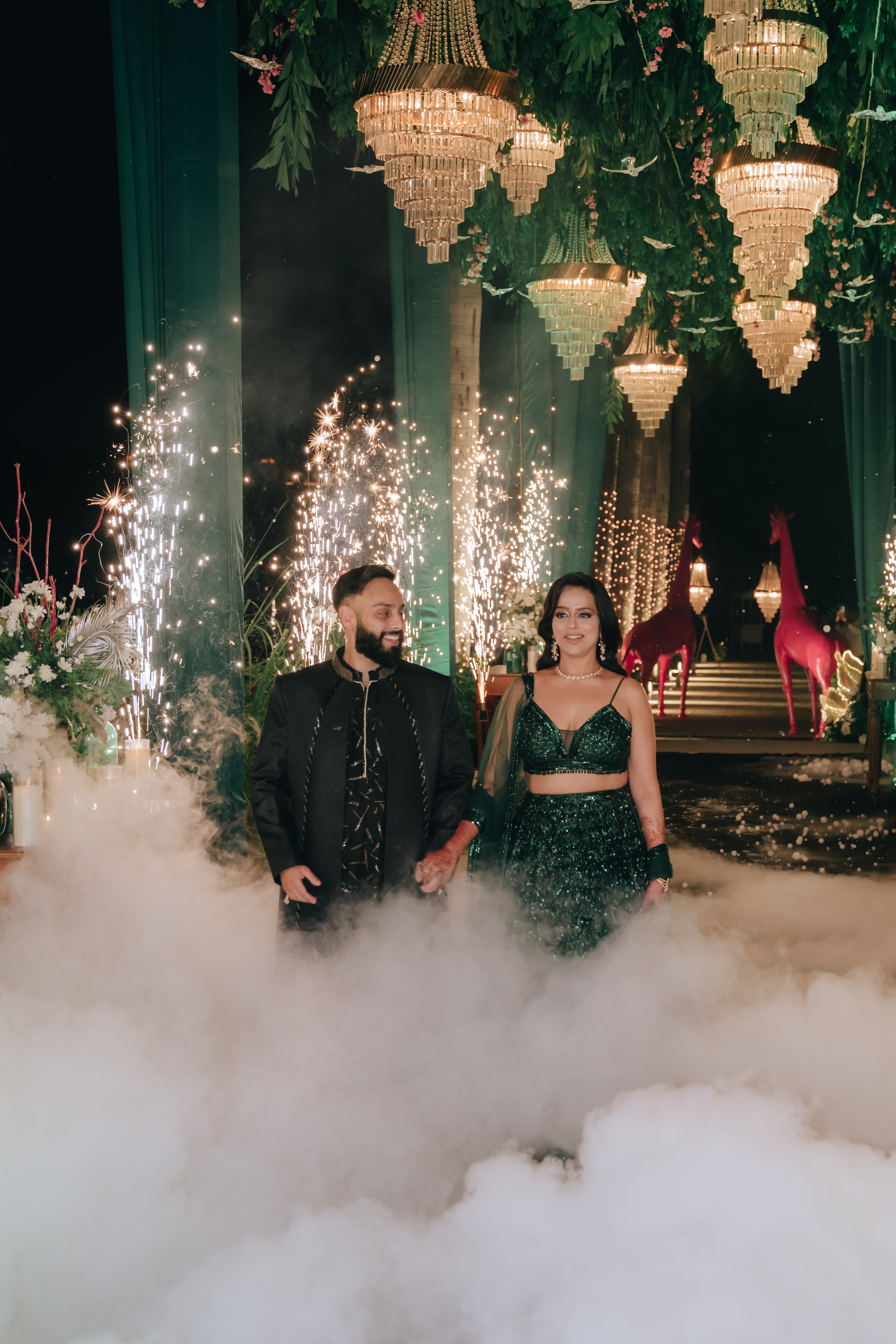 For the Sangeet, we transformed the venue into an enchanted forest. Cascading foliage draped the ceiling, crystal chandeliers sparkled like drops of moonlight, and delicate pink blooms peeked through the greens. Soft golden lighting bathed the space in warmth, while the stage glowed against a backdrop of twinkling lights. Every sway of the dancers below felt like it was unfolding beneath a magical canopy, bringing the night’s celebration to life in the most whimsical way.